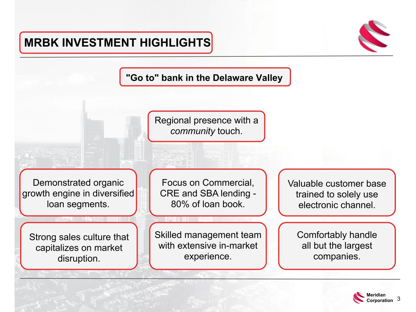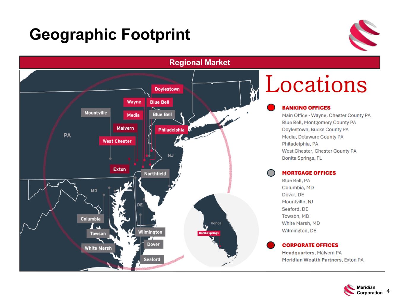 MRBK INVESTMENT HIGHLIGHTS Regional presence with a community touch. "Go to" bank in the Delaware Valley Demonstrated organic growth engine in diversified loan segments. Focus on Commercial, CRE and SBA lending - 80% of loan book. Valuable customer base trained to solely use electronic channel. Strong sales culture that capitalizes on market disruption. Skilled management team with extensive in-market experience. Comfortably handle all but the largest companies. Meridian Corporation 3