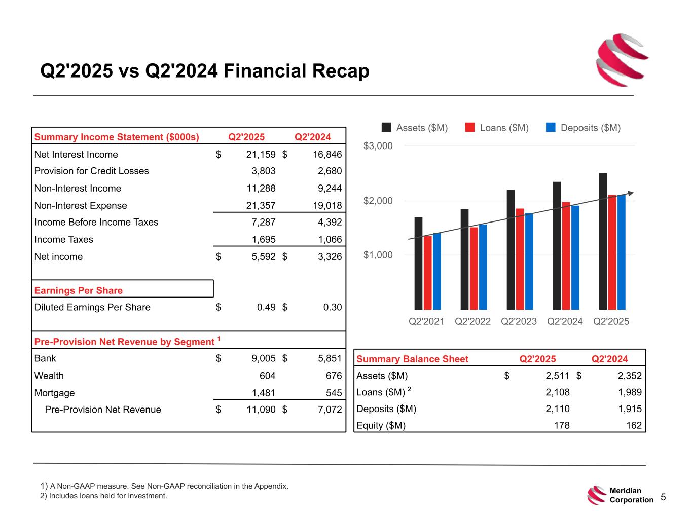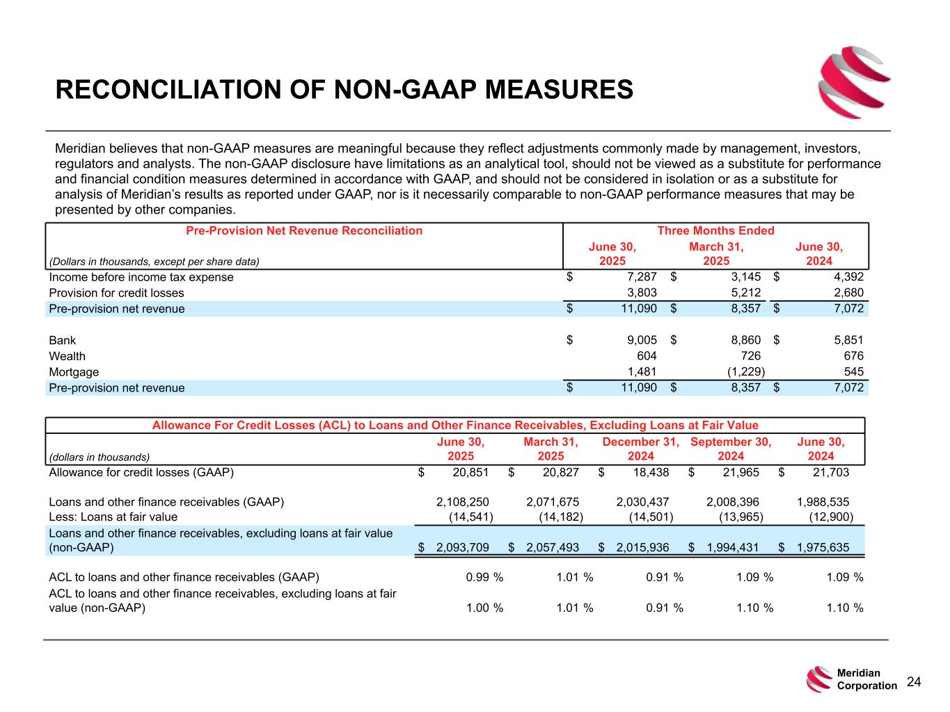 Allowance For Credit Losses (ACL) to Loans and Other Finance Receivables, Excluding Loans at Fair Value (dollars in thousands) June 30, 2025 March 31, 2025 December 31, 2024 September 30, 2024 June 30, 2024 Allowance for credit losses (GAAP) $ 20,851 $ 20,827 $ 18,438 $ 21,965 $ 21,703 Loans and other finance receivables (GAAP) 2,108,250 2,071,675 2,030,437 2,008,396 1,988,535 Less: Loans at fair value (14,541) (14,182) (14,501) (13,965) (12,900) Loans and other finance receivables, excluding loans at fair value (non-GAAP) $ 2,093,709 $ 2,057,493 $ 2,015,936 $ 1,994,431 $ 1,975,635 ACL to loans and other finance receivables (GAAP) 0.99 % 1.01 % 0.91 % 1.09 % 1.09 % ACL to loans and other finance receivables, excluding loans at fair value (non-GAAP) 1.00 % 1.01 % 0.91 % 1.10 % 1.10 % RECONCILIATION OF NON-GAAP MEASURES Meridian believes that non-GAAP measures are meaningful because they reflect adjustments commonly made by management, investors, regulators and analysts. The non-GAAP disclosure have limitations as an analytical tool, should not be viewed as a substitute for performance and financial condition measures determined in accordance with GAAP, and should not be considered in isolation or as a substitute for analysis of Meridian’s results as reported under GAAP, nor is it necessarily comparable to non-GAAP performance measures that may be presented by other companies. Pre-Provision Net Revenue Reconciliation Three Months Ended (Dollars in thousands, except per share data) June 30, 2025 March 31, 2025 June 30, 2024 Income before income tax expense $ 7,287 $ 3,145 $ 4,392 Provision for credit losses 3,803 5,212 2,680 Pre-provision net revenue $ 11,090 $ 8,357 $ 7,072 Bank $ 9,005 $ 8,860 $ 5,851 Wealth 604 726 676 Mortgage 1,481 (1,229) 545 Pre-provision net revenue $ 11,090 $ 8,357 $ 7,072 Meridian Corporation 24