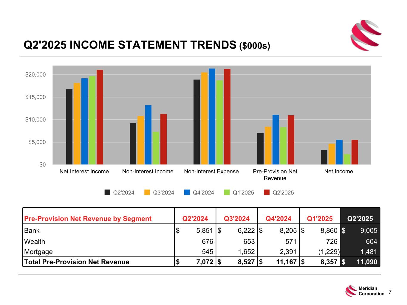 Q2'2025 INCOME STATEMENT TRENDS ($000s) Pre-Provision Net Revenue by Segment Q2'2024 Q3'2024 Q4'2024 Q1'2025 Q2'2025 Bank $ 5,851 $ 6,222 $ 8,205 $ 8,860 $ 9,005 Wealth 676 653 571 726 604 Mortgage 545 1,652 2,391 (1,229) 1,481 Total Pre-Provision Net Revenue $ 7,072 $ 8,527 $ 11,167 $ 8,357 $ 11,090 Q2'2024 Q3'2024 Q4'2024 Q1'2025 Q2'2025 Net Interest Income Non-Interest Income Non-Interest Expense Pre-Provision Net Revenue Net Income $0 $5,000 $10,000 $15,000 $20,000 Meridian Corporation 7