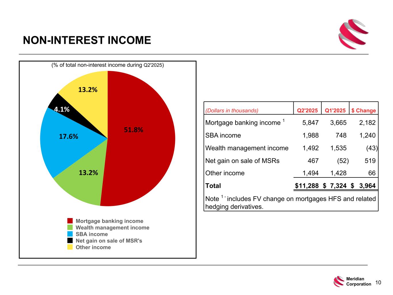 NON-INTEREST INCOME (Dollars in thousands) Q2'2025 Q1'2025 $ Change Mortgage banking income 1 5,847 3,665 2,182 SBA income 1,988 748 1,240 Wealth management income 1,492 1,535 (43) Net gain on sale of MSRs 467 (52) 519 Other income 1,494 1,428 66 Total $ 11,288 $ 7,324 $ 3,964 Note 1 - includes FV change on mortgages HFS and related hedging derivatives. 51.8% 13.2% 17.6% 4.1% 13.2% Mortgage banking income Wealth management income SBA income Net gain on sale of MSR's Other income (% of total non-interest income during Q2'2025) Meridian Corporation 10