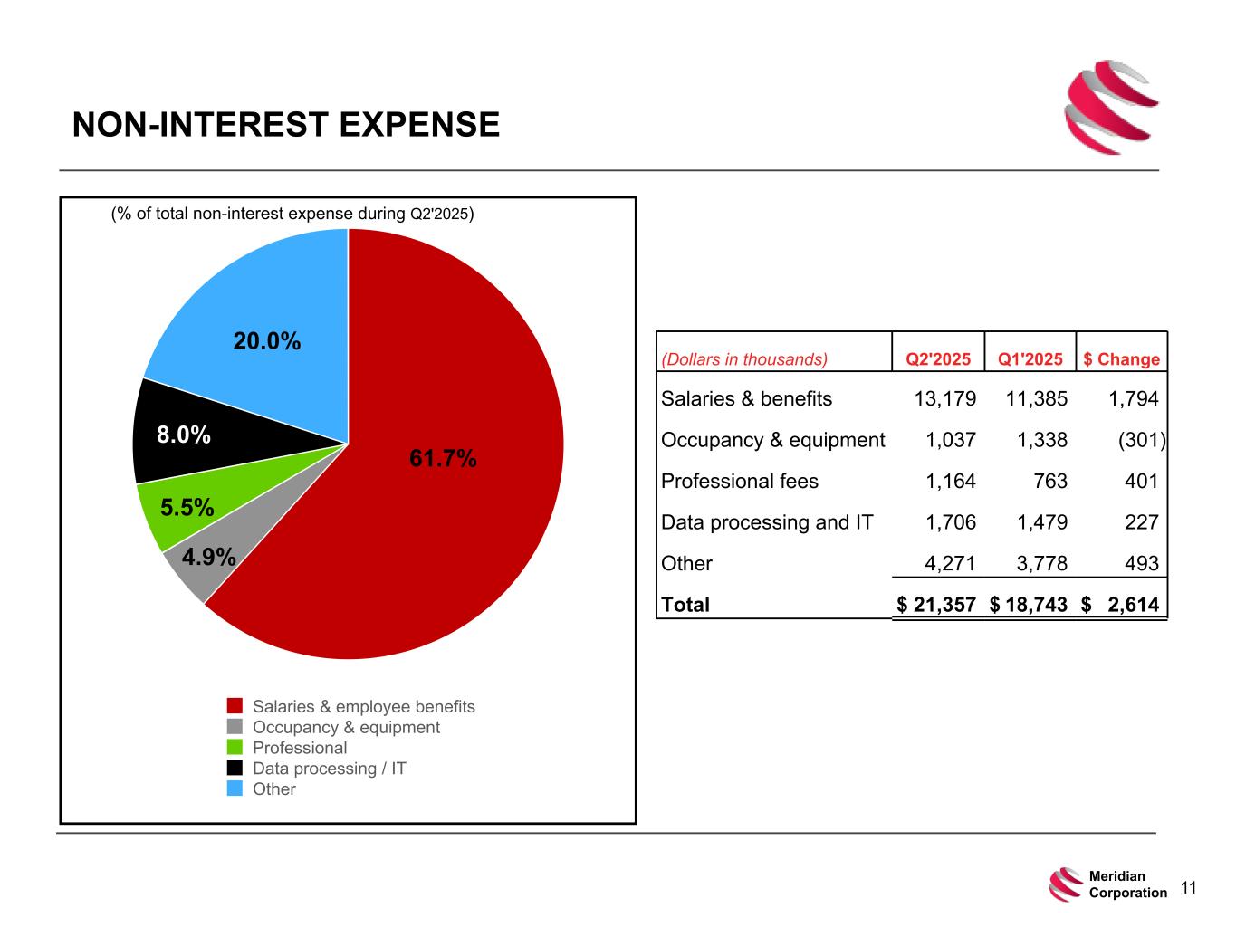 NON-INTEREST EXPENSE (% of total non-interest expense during Q2'2025) (Dollars in thousands) Q2'2025 Q1'2025 $ Change Salaries & benefits 13,179 11,385 1,794 Occupancy & equipment 1,037 1,338 (301) Professional fees 1,164 763 401 Data processing and IT 1,706 1,479 227 Other 4,271 3,778 493 Total $ 21,357 $ 18,743 $ 2,614 61.7% 4.9% 5.5% 8.0% 20.0% Salaries & employee benefits Occupancy & equipment Professional Data processing / IT Other Meridian Corporation 11