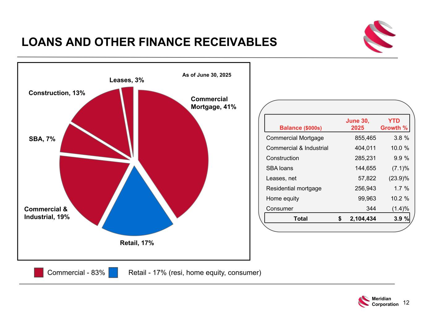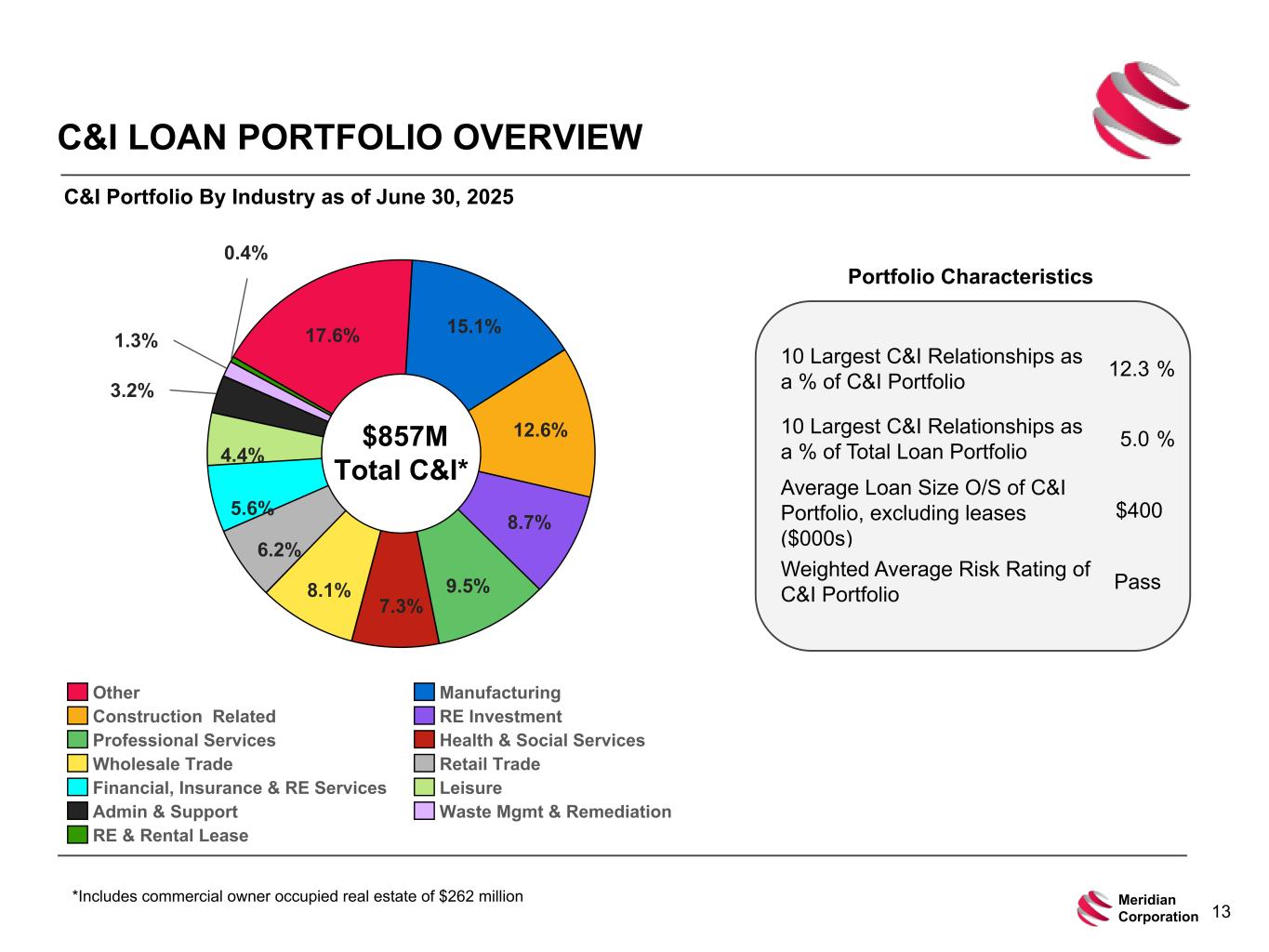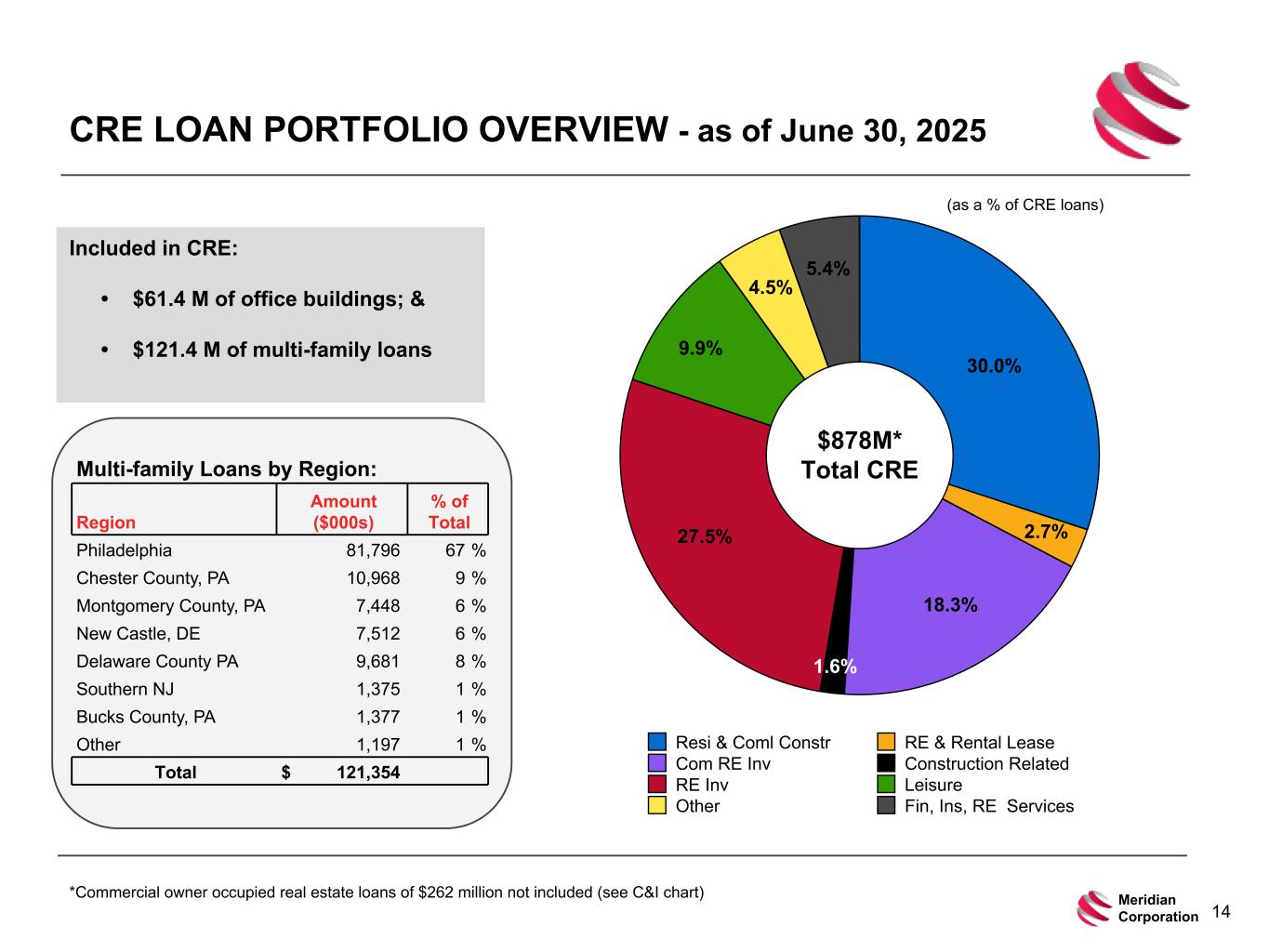 30.0% 2.7% 18.3% 1.6% 27.5% 9.9% 4.5% 5.4% Resi & Coml Constr RE & Rental Lease Com RE Inv Construction Related RE Inv Leisure Other Fin, Ins, RE Services CRE LOAN PORTFOLIO OVERVIEW - as of June 30, 2025 $878M* Total CRE (as a % of CRE loans) *Commercial owner occupied real estate loans of $262 million not included (see C&I chart) Included in CRE: • $61.4 M of office buildings; & • $121.4 M of multi-family loans Meridian Corporation Multi-family Loans by Region: Region Amount ($000s) % of Total Philadelphia 81,796 67 % Chester County, PA 10,968 9 % Montgomery County, PA 7,448 6 % New Castle, DE 7,512 6 % Delaware County PA 9,681 8 % Southern NJ 1,375 1 % Bucks County, PA 1,377 1 % Other 1,197 1 % Total $ 121,354 14
