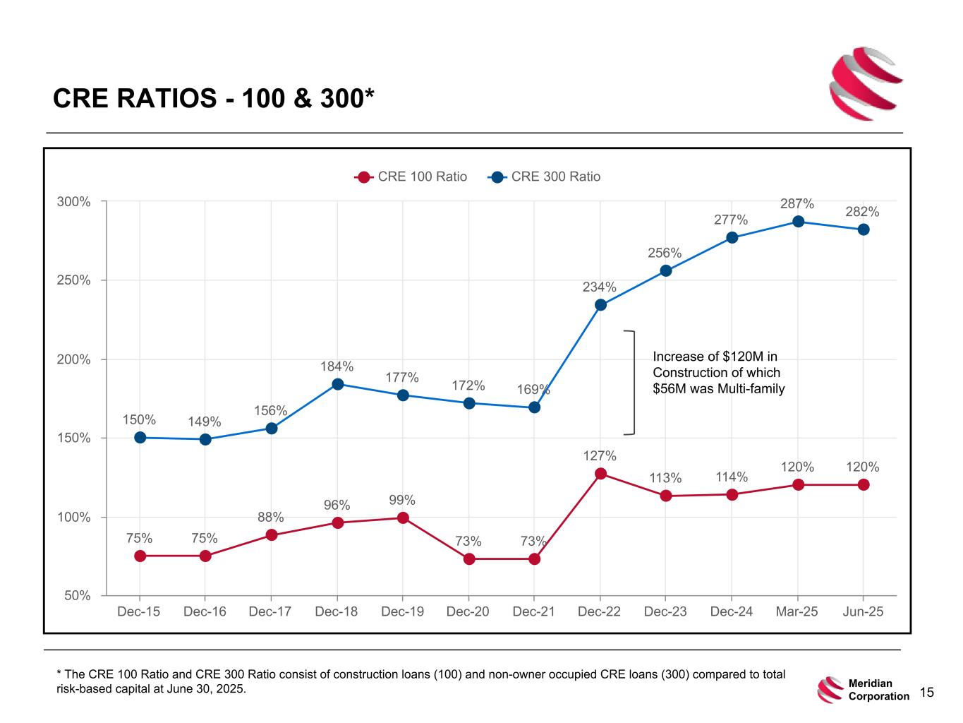 CRE RATIOS - 100 & 300* 75% 75% 88% 96% 99% 73% 73% 127% 113% 114% 120% 120% 150% 149% 156% 184% 177% 172% 169% 234% 256% 277% 287% 282% CRE 100 Ratio CRE 300 Ratio Dec-15 Dec-16 Dec-17 Dec-18 Dec-19 Dec-20 Dec-21 Dec-22 Dec-23 Dec-24 Mar-25 Jun-25 50% 100% 150% 200% 250% 300% Increase of $120M in Construction of which $56M was Multi-family Meridian Corporation 15 * The CRE 100 Ratio and CRE 300 Ratio consist of construction loans (100) and non-owner occupied CRE loans (300) compared to total risk-based capital at June 30, 2025.
