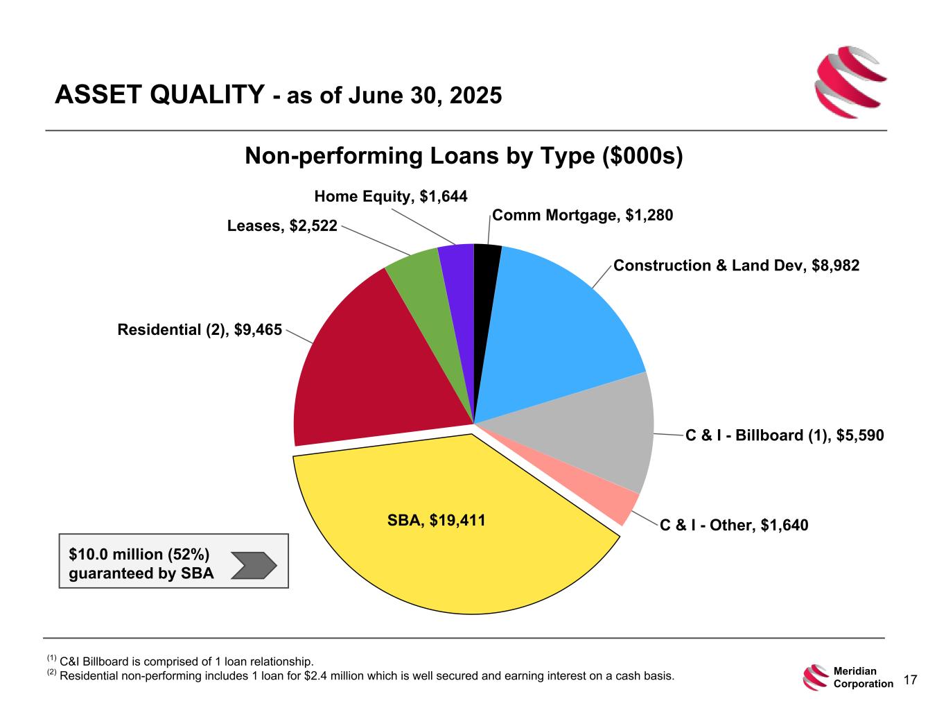 6.79% 6.82% 7.89% 11.10% 11.50% 11.47% 10.53% 1.01% 0.54% 1.12% 3.43% 3.96% 3.56% 3.52% Yield on SBA Loans Cost of Funds FYE 20 FYE 21 FYE 22 FYE 23 FYE 24 Q1'25 Q2'25 —% 5.00% 10.00% 15.00% SBA Loan Portfolio Overview SBA Loan Portfolio Profitability ($000s) Yield vs. Cost $4,639 $11,773 $13,280 $15,976 $15,245 $3,808 $4,918 $2,478 $1,172 $2,469 $3,463 $2,555 $1,375 Total Net Revenue Provision for Credit Losses FYE 20 FYE 21 FYE 22 FYE 23 FYE 24 Q1'25 Q2'25 $5,000 $10,000 $15,000 • $144.7 million loans outstanding at June 30, 2025. • Very profitable portfolio. • Spread on SBA portfolio - 7.0% for Q2 2025. • 71% of non-performing loans as of June 30, 2025 were originated during 2020-2021 prior to 500+ bps rise in rates. Meridian Corporation 16