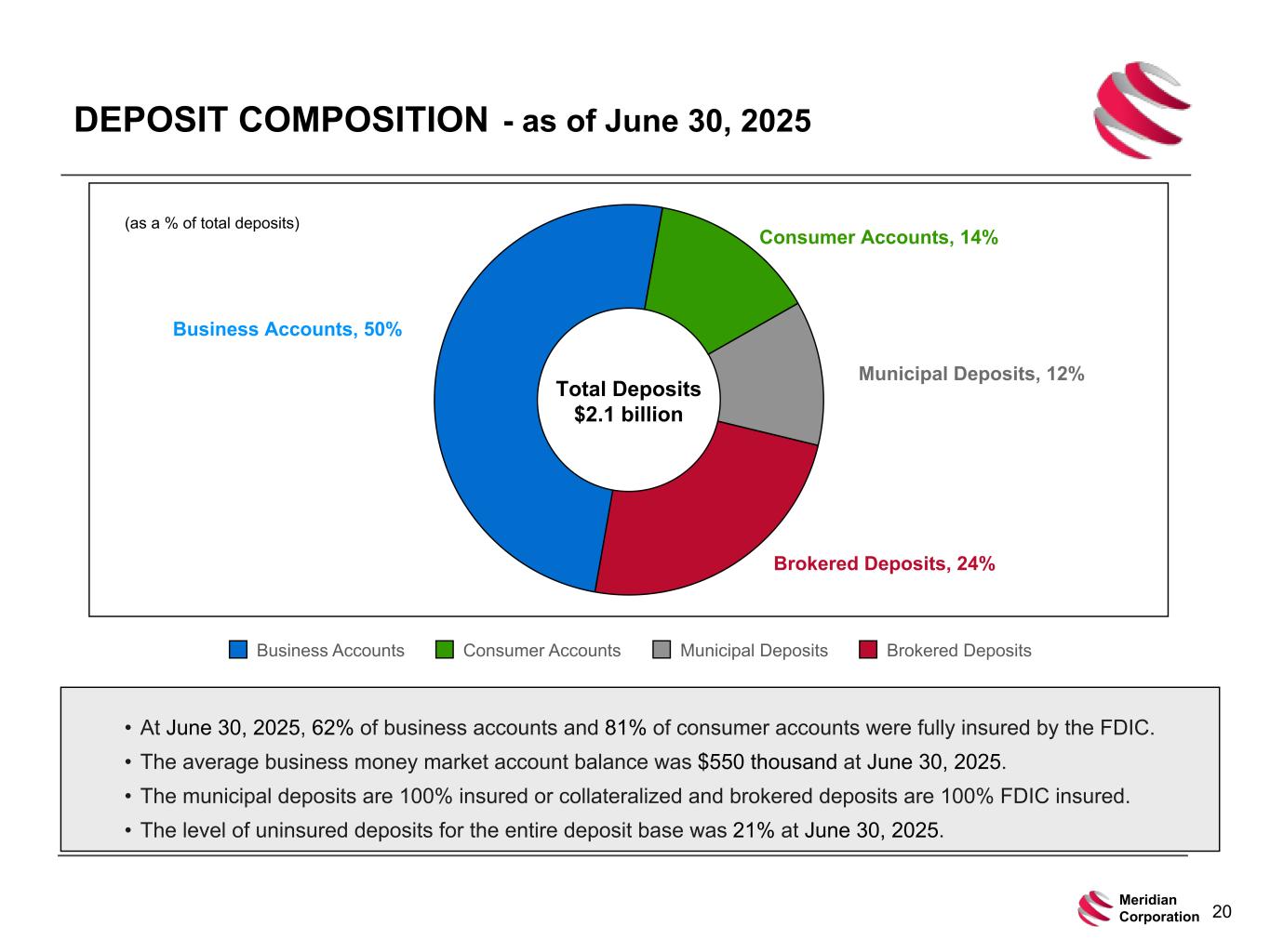 MORTGAGE VOLUME & MARGIN TRENDS ($000s) 2.89% 2.71% 2.76% 2.95% 2.81% 2.82% 2.73% 2.63% 2.86% Closed and Funded - Purchase Closed and Funded - Refi Sold Volume Margin Q2'2023 Q3'2023 Q4'2023 Q1'2024 Q2'2024 Q3'2024 Q4'2024 Q1'2025 Q2'2025 0 50 100 150 200 250 300 2.00% 2.20% 2.40% 2.60% 2.80% 3.00% Q2'2023 Q3'2023 Q4'2023 Q1'2024 Q2'2024 Q3'2024 Q4'2024 Q1'2025 Q2'2025 Refinance (%) 9% 10% 13% 16% 10% 12% 16% 18% 14% Purchase (%) 91% 90% 87% 84% 90% 88% 84% 82% 86% Meridian Corporation 19
