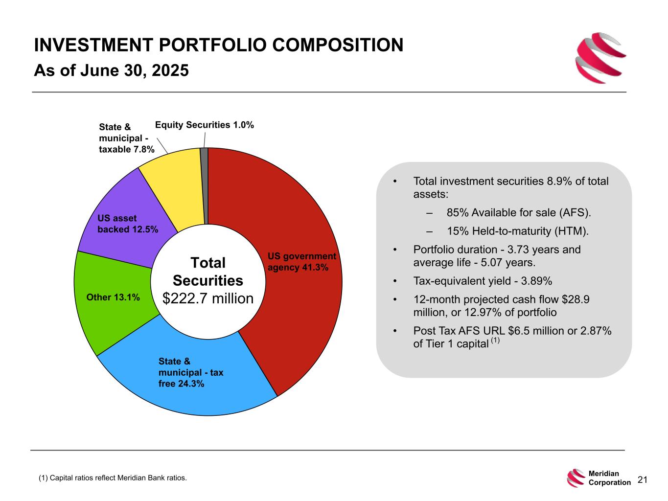 INVESTMENT PORTFOLIO COMPOSITION As of June 30, 2025 • Total investment securities 8.9% of total assets: – 85% Available for sale (AFS). – 15% Held-to-maturity (HTM). • Portfolio duration - 3.73 years and average life - 5.07 years. • Tax-equivalent yield - 3.89% • 12-month projected cash flow $28.9 million, or 12.97% of portfolio • Post Tax AFS URL $6.5 million or 2.87% of Tier 1 capital (1) (1) Capital ratios reflect Meridian Bank ratios. US government agency 41.3% State & municipal - tax free 24.3% Other 13.1% US asset backed 12.5% State & municipal - taxable 7.8% Equity Securities 1.0% Total Securities $222.7 million Meridian Corporation 21