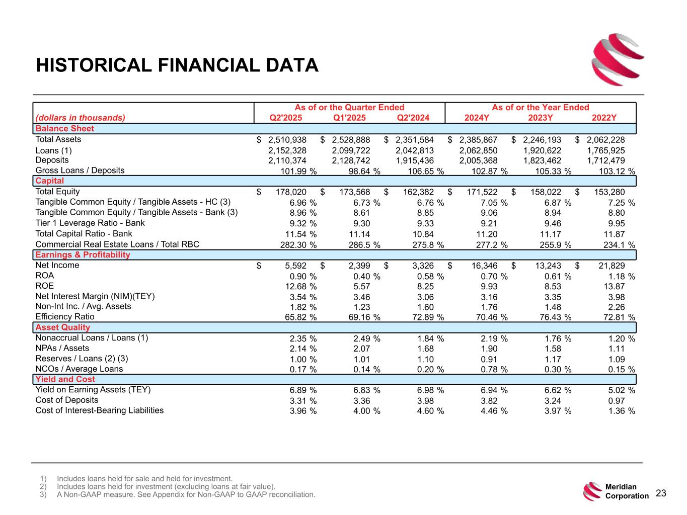 HISTORICAL FINANCIAL DATA 1) Includes loans held for sale and held for investment. 2) Includes loans held for investment (excluding loans at fair value). 3) A Non-GAAP measure. See Appendix for Non-GAAP to GAAP reconciliation. As of or the Quarter Ended As of or the Year Ended (dollars in thousands) Q2'2025 Q1'2025 Q2'2024 2024Y 2023Y 2022Y Balance Sheet Total Assets $ 2,510,938 $ 2,528,888 $ 2,351,584 $ 2,385,867 $ 2,246,193 $ 2,062,228 Loans (1) 2,152,328 2,099,722 2,042,813 2,062,850 1,920,622 1,765,925 Deposits 2,110,374 2,128,742 1,915,436 2,005,368 1,823,462 1,712,479 Gross Loans / Deposits 101.99 % 98.64 % 106.65 % 102.87 % 105.33 % 103.12 % Capital Total Equity $ 178,020 $ 173,568 $ 162,382 $ 171,522 $ 158,022 $ 153,280 Tangible Common Equity / Tangible Assets - HC (3) 6.96 % 6.73 % 6.76 % 7.05 % 6.87 % 7.25 % Tangible Common Equity / Tangible Assets - Bank (3) 8.96 % 8.61 8.85 9.06 8.94 8.80 Tier 1 Leverage Ratio - Bank 9.32 % 9.30 9.33 9.21 9.46 9.95 Total Capital Ratio - Bank 11.54 % 11.14 10.84 11.20 11.17 11.87 Commercial Real Estate Loans / Total RBC 282.30 % 286.5 % 275.8 % 277.2 % 255.9 % 234.1 % Earnings & Profitability Net Income $ 5,592 $ 2,399 $ 3,326 $ 16,346 $ 13,243 $ 21,829 ROA 0.90 % 0.40 % 0.58 % 0.70 % 0.61 % 1.18 % ROE 12.68 % 5.57 8.25 9.93 8.53 13.87 Net Interest Margin (NIM)(TEY) 3.54 % 3.46 3.06 3.16 3.35 3.98 Non-Int Inc. / Avg. Assets 1.82 % 1.23 1.60 1.76 1.48 2.26 Efficiency Ratio 65.82 % 69.16 % 72.89 % 70.46 % 76.43 % 72.81 % Asset Quality Nonaccrual Loans / Loans (1) 2.35 % 2.49 % 1.84 % 2.19 % 1.76 % 1.20 % NPAs / Assets 2.14 % 2.07 1.68 1.90 1.58 1.11 Reserves / Loans (2) (3) 1.00 % 1.01 1.10 0.91 1.17 1.09 NCOs / Average Loans 0.17 % 0.14 % 0.20 % 0.78 % 0.30 % 0.15 % Yield and Cost Yield on Earning Assets (TEY) 6.89 % 6.83 % 6.98 % 6.94 % 6.62 % 5.02 % Cost of Deposits 3.31 % 3.36 3.98 3.82 3.24 0.97 Cost of Interest-Bearing Liabilities 3.96 % 4.00 % 4.60 % 4.46 % 3.97 % 1.36 % Meridian Corporation 23