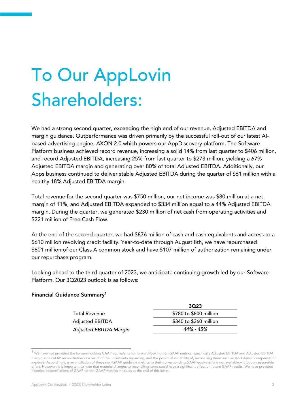 To Our AppLovin Shareholders: We had a strong second quarter, exceeding the high end of our revenue, Adjusted EBITDA and margin guidance. Outperformance was driven primarily by the successful roll-out of our latest AI- based advertising engine, AXON 2.0 which powers our AppDiscovery platform. The Software Platform business achieved record revenue, increasing a solid 14% from last quarter to $406 million, and record Adjusted EBITDA, increasing 25% from last quarter to $273 million, yielding a 67% Adjusted EBITDA margin and generating over 80% of total Adjusted EBITDA. Additionally, our Apps business continued to deliver stable Adjusted EBITDA during the quarter of $61 million with a healthy 18% Adjusted EBITDA margin. Total revenue for the second quarter was $750 million, our net income was $80 million at a net margin of 11%, and Adjusted EBITDA expanded to $334 million equal to a 44% Adjusted EBITDA margin. During the quarter, we generated $230 million of net cash from operating activities and $221 million of Free Cash Flow. At the end of the second quarter, we had $876 million of cash and cash equivalents and access to a $610 million revolving credit facility. Year-to-date through August 8th, we have repurchased $601 million of our Class A common stock and have $107 million of authorization remaining under our repurchase program. Looking ahead to the third quarter of 2023, we anticipate continuing growth led by our Software Platform. Our 3Q2023 outlook is as follows: Financial Guidance Summary1 3Q23 Total Revenue $780 to $800 million Adjusted EBITDA $340 to $360 million Adjusted EBITDA Margin 44% - 45% AppLovin Corporation / 2Q23 Shareholder Letter 2 1 We have not provided the forward-looking GAAP equivalents for forward-looking non-GAAP metrics, specifically Adjusted EBITDA and Adjusted EBITDA margin, or a GAAP reconciliation as a result of the uncertainty regarding, and the potential variability of, reconciling items such as stock-based compensation expense. Accordingly, a reconciliation of these non-GAAP guidance metrics to their corresponding GAAP equivalents is not available without unreasonable effort. However, it is important to note that material changes to reconciling items could have a significant effect on future GAAP results. We have provided historical reconciliations of GAAP to non-GAAP metrics in tables at the end of this letter.
