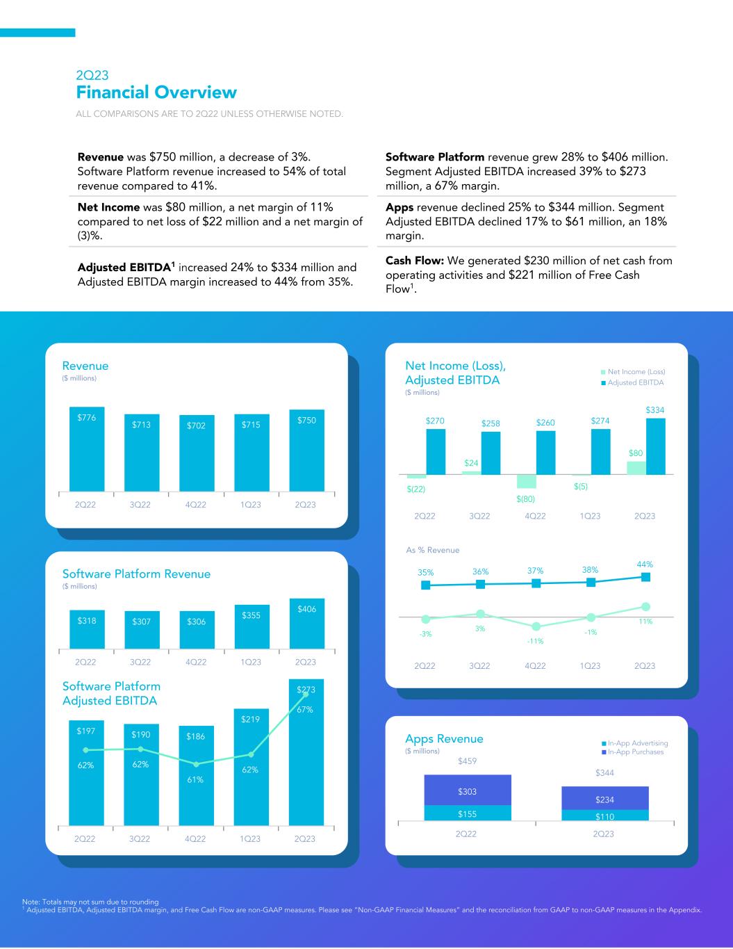 $776 $713 $702 $715 $750 2Q22 3Q22 4Q22 1Q23 2Q23 Revenue ($ millions) $318 $307 $306 $355 $406 2Q22 3Q22 4Q22 1Q23 2Q23 Software Platform Revenue ($ millions) $197 $190 $186 $219 $273 62% 62% 61% 62% 67% 2Q22 3Q22 4Q22 1Q23 2Q23 Software Platform Adjusted EBITDA $(22) $24 $(80) $(5) $80 $270 $258 $260 $274 $334 2Q22 3Q22 4Q22 1Q23 2Q23 Net Income (Loss), Adjusted EBITDA ($ millions) Net Income (Loss) Adjusted EBITDA 35% 36% 37% 38% 44% -3% 3% -11% -1% 11% 2Q22 3Q22 4Q22 1Q23 2Q23 As % Revenue $155 $110 $303 $234 $459 $344 2Q22 2Q23 Apps Revenue ($ millions) In-App Advertising In-App Purchases 2Q23 Financial Overview ALL COMPARISONS ARE TO 2Q22 UNLESS OTHERWISE NOTED. Revenue was $750 million, a decrease of 3%. Software Platform revenue increased to 54% of total revenue compared to 41%. Software Platform revenue grew 28% to $406 million. Segment Adjusted EBITDA increased 39% to $273 million, a 67% margin. Net Income was $80 million, a net margin of 11% compared to net loss of $22 million and a net margin of (3)%. Apps revenue declined 25% to $344 million. Segment Adjusted EBITDA declined 17% to $61 million, an 18% margin. Adjusted EBITDA1 increased 24% to $334 million and Adjusted EBITDA margin increased to 44% from 35%. Cash Flow: We generated $230 million of net cash from operating activities and $221 million of Free Cash Flow1. Note: Totals may not sum due to rounding 1 Adjusted EBITDA, Adjusted EBITDA margin, and Free Cash Flow are non-GAAP measures. Please see “Non-GAAP Financial Measures” and the reconciliation from GAAP to non-GAAP measures in the Appendix.