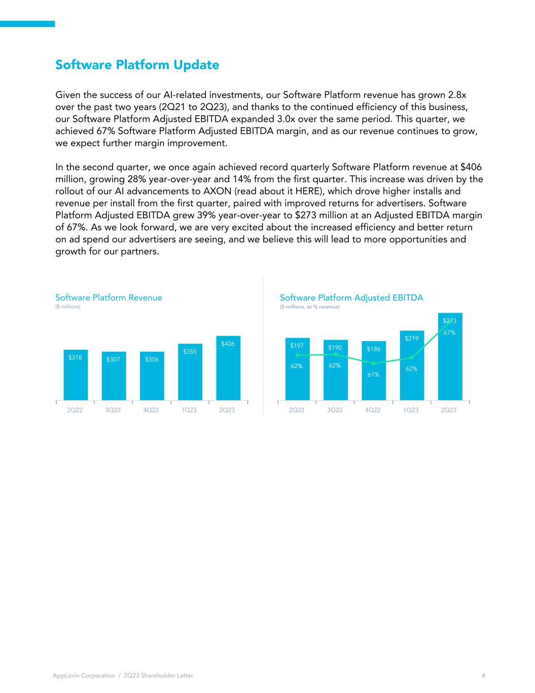 Software Platform Update Given the success of our AI-related investments, our Software Platform revenue has grown 2.8x over the past two years (2Q21 to 2Q23), and thanks to the continued efficiency of this business, our Software Platform Adjusted EBITDA expanded 3.0x over the same period. This quarter, we achieved 67% Software Platform Adjusted EBITDA margin, and as our revenue continues to grow, we expect further margin improvement. In the second quarter, we once again achieved record quarterly Software Platform revenue at $406 million, growing 28% year-over-year and 14% from the first quarter. This increase was driven by the rollout of our AI advancements to AXON (read about it HERE), which drove higher installs and revenue per install from the first quarter, paired with improved returns for advertisers. Software Platform Adjusted EBITDA grew 39% year-over-year to $273 million at an Adjusted EBITDA margin of 67%. As we look forward, we are very excited about the increased efficiency and better return on ad spend our advertisers are seeing, and we believe this will lead to more opportunities and growth for our partners. $318 $307 $306 $355 $406 2Q22 3Q22 4Q22 1Q23 2Q23 Software Platform Revenue ($ millions) $197 $190 $186 $219 $273 62% 62% 61% 62% 67% 2Q22 3Q22 4Q22 1Q23 2Q23 Software Platform Adjusted EBITDA ($ millions, as % revenue) AppLovin Corporation / 2Q23 Shareholder Letter 4