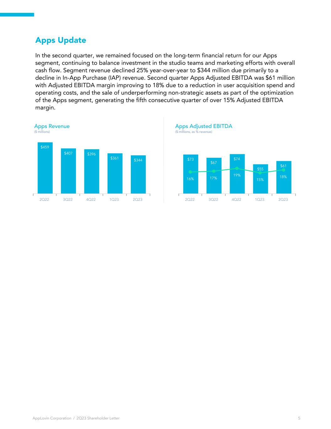 Apps Update In the second quarter, we remained focused on the long-term financial return for our Apps segment, continuing to balance investment in the studio teams and marketing efforts with overall cash flow. Segment revenue declined 25% year-over-year to $344 million due primarily to a decline in In-App Purchase (IAP) revenue. Second quarter Apps Adjusted EBITDA was $61 million with Adjusted EBITDA margin improving to 18% due to a reduction in user acquisition spend and operating costs, and the sale of underperforming non-strategic assets as part of the optimization of the Apps segment, generating the fifth consecutive quarter of over 15% Adjusted EBITDA margin. $459 $407 $396 $361 $344 2Q22 3Q22 4Q22 1Q23 2Q23 Apps Revenue ($ millions) $73 $67 $74 $55 $61 16% 17% 19% 15% 18% 2Q22 3Q22 4Q22 1Q23 2Q23 Apps Adjusted EBITDA ($ millions, as % revenue) AppLovin Corporation / 2Q23 Shareholder Letter 5