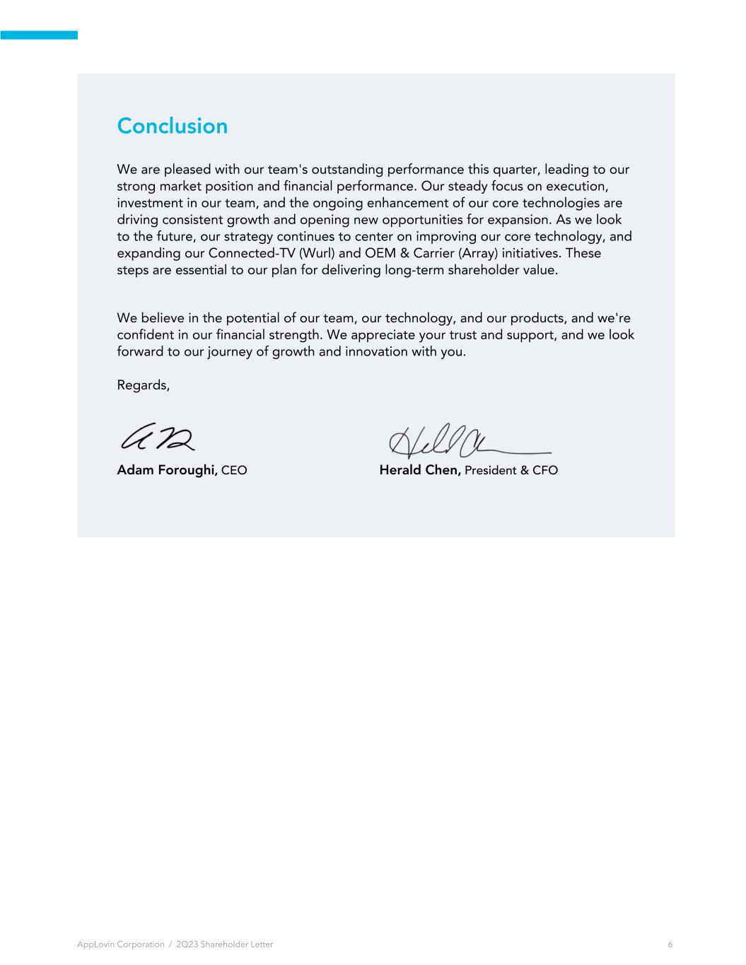 Conclusion We are pleased with our team's outstanding performance this quarter, leading to our strong market position and financial performance. Our steady focus on execution, investment in our team, and the ongoing enhancement of our core technologies are driving consistent growth and opening new opportunities for expansion. As we look to the future, our strategy continues to center on improving our core technology, and expanding our Connected-TV (Wurl) and OEM & Carrier (Array) initiatives. These steps are essential to our plan for delivering long-term shareholder value. We believe in the potential of our team, our technology, and our products, and we're confident in our financial strength. We appreciate your trust and support, and we look forward to our journey of growth and innovation with you. Regards, Adam Foroughi, CEO Herald Chen, President & CFO AppLovin Corporation / 2Q23 Shareholder Letter 6