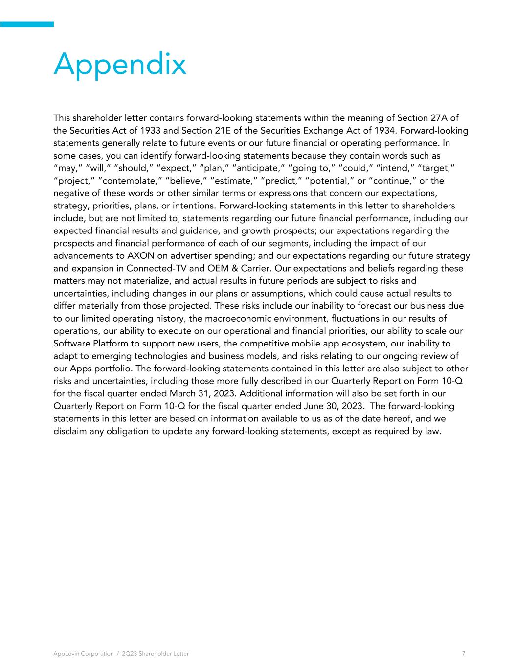 Appendix This shareholder letter contains forward-looking statements within the meaning of Section 27A of the Securities Act of 1933 and Section 21E of the Securities Exchange Act of 1934. Forward-looking statements generally relate to future events or our future financial or operating performance. In some cases, you can identify forward-looking statements because they contain words such as “may,” “will,” “should,” “expect,” “plan,” “anticipate,” “going to,” “could,” “intend,” “target,” “project,” “contemplate,” “believe,” “estimate,” “predict,” “potential,” or “continue,” or the negative of these words or other similar terms or expressions that concern our expectations, strategy, priorities, plans, or intentions. Forward-looking statements in this letter to shareholders include, but are not limited to, statements regarding our future financial performance, including our expected financial results and guidance, and growth prospects; our expectations regarding the prospects and financial performance of each of our segments, including the impact of our advancements to AXON on advertiser spending; and our expectations regarding our future strategy and expansion in Connected-TV and OEM & Carrier. Our expectations and beliefs regarding these matters may not materialize, and actual results in future periods are subject to risks and uncertainties, including changes in our plans or assumptions, which could cause actual results to differ materially from those projected. These risks include our inability to forecast our business due to our limited operating history, the macroeconomic environment, fluctuations in our results of operations, our ability to execute on our operational and financial priorities, our ability to scale our Software Platform to support new users, the competitive mobile app ecosystem, our inability to adapt to emerging technologies and business models, and risks relating to our ongoing review of our Apps portfolio. The forward-looking statements contained in this letter are also subject to other risks and uncertainties, including those more fully described in our Quarterly Report on Form 10-Q for the fiscal quarter ended March 31, 2023. Additional information will also be set forth in our Quarterly Report on Form 10-Q for the fiscal quarter ended June 30, 2023. The forward-looking statements in this letter are based on information available to us as of the date hereof, and we disclaim any obligation to update any forward-looking statements, except as required by law. AppLovin Corporation / 2Q23 Shareholder Letter 7