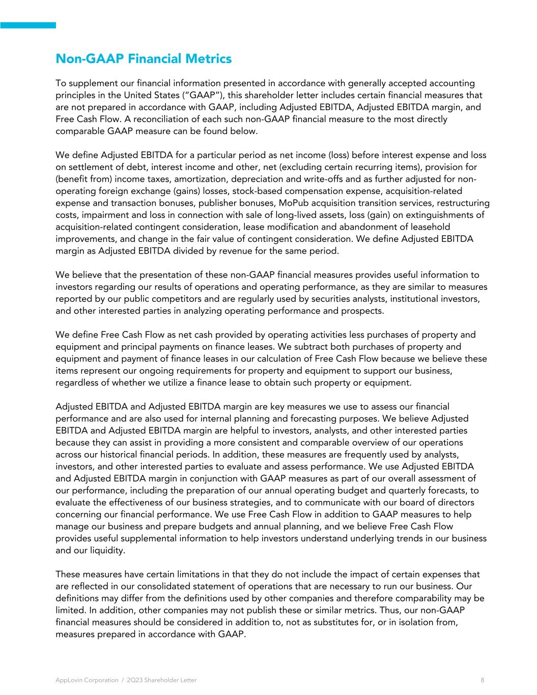 Non-GAAP Financial Metrics To supplement our financial information presented in accordance with generally accepted accounting principles in the United States (“GAAP”), this shareholder letter includes certain financial measures that are not prepared in accordance with GAAP, including Adjusted EBITDA, Adjusted EBITDA margin, and Free Cash Flow. A reconciliation of each such non-GAAP financial measure to the most directly comparable GAAP measure can be found below. We define Adjusted EBITDA for a particular period as net income (loss) before interest expense and loss on settlement of debt, interest income and other, net (excluding certain recurring items), provision for (benefit from) income taxes, amortization, depreciation and write-offs and as further adjusted for non- operating foreign exchange (gains) losses, stock-based compensation expense, acquisition-related expense and transaction bonuses, publisher bonuses, MoPub acquisition transition services, restructuring costs, impairment and loss in connection with sale of long-lived assets, loss (gain) on extinguishments of acquisition-related contingent consideration, lease modification and abandonment of leasehold improvements, and change in the fair value of contingent consideration. We define Adjusted EBITDA margin as Adjusted EBITDA divided by revenue for the same period. We believe that the presentation of these non-GAAP financial measures provides useful information to investors regarding our results of operations and operating performance, as they are similar to measures reported by our public competitors and are regularly used by securities analysts, institutional investors, and other interested parties in analyzing operating performance and prospects. We define Free Cash Flow as net cash provided by operating activities less purchases of property and equipment and principal payments on finance leases. We subtract both purchases of property and equipment and payment of finance leases in our calculation of Free Cash Flow because we believe these items represent our ongoing requirements for property and equipment to support our business, regardless of whether we utilize a finance lease to obtain such property or equipment. Adjusted EBITDA and Adjusted EBITDA margin are key measures we use to assess our financial performance and are also used for internal planning and forecasting purposes. We believe Adjusted EBITDA and Adjusted EBITDA margin are helpful to investors, analysts, and other interested parties because they can assist in providing a more consistent and comparable overview of our operations across our historical financial periods. In addition, these measures are frequently used by analysts, investors, and other interested parties to evaluate and assess performance. We use Adjusted EBITDA and Adjusted EBITDA margin in conjunction with GAAP measures as part of our overall assessment of our performance, including the preparation of our annual operating budget and quarterly forecasts, to evaluate the effectiveness of our business strategies, and to communicate with our board of directors concerning our financial performance. We use Free Cash Flow in addition to GAAP measures to help manage our business and prepare budgets and annual planning, and we believe Free Cash Flow provides useful supplemental information to help investors understand underlying trends in our business and our liquidity. These measures have certain limitations in that they do not include the impact of certain expenses that are reflected in our consolidated statement of operations that are necessary to run our business. Our definitions may differ from the definitions used by other companies and therefore comparability may be limited. In addition, other companies may not publish these or similar metrics. Thus, our non-GAAP financial measures should be considered in addition to, not as substitutes for, or in isolation from, measures prepared in accordance with GAAP. AppLovin Corporation / 2Q23 Shareholder Letter 8