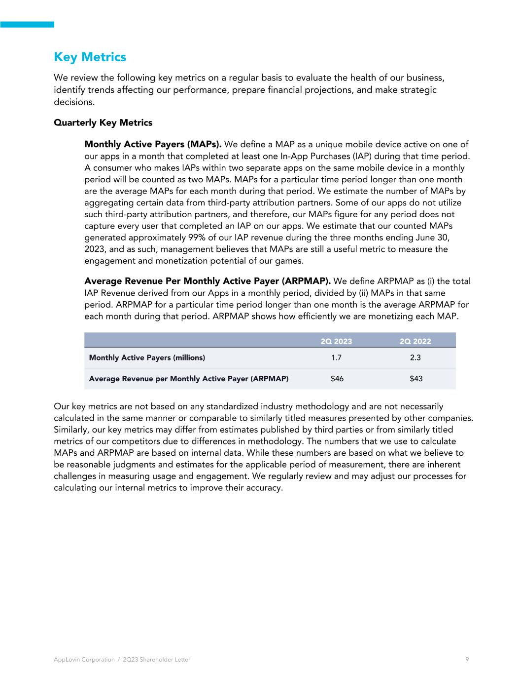 Key Metrics We review the following key metrics on a regular basis to evaluate the health of our business, identify trends affecting our performance, prepare financial projections, and make strategic decisions. Quarterly Key Metrics Monthly Active Payers (MAPs). We define a MAP as a unique mobile device active on one of our apps in a month that completed at least one In-App Purchases (IAP) during that time period. A consumer who makes IAPs within two separate apps on the same mobile device in a monthly period will be counted as two MAPs. MAPs for a particular time period longer than one month are the average MAPs for each month during that period. We estimate the number of MAPs by aggregating certain data from third-party attribution partners. Some of our apps do not utilize such third-party attribution partners, and therefore, our MAPs figure for any period does not capture every user that completed an IAP on our apps. We estimate that our counted MAPs generated approximately 99% of our IAP revenue during the three months ending June 30, 2023, and as such, management believes that MAPs are still a useful metric to measure the engagement and monetization potential of our games. Average Revenue Per Monthly Active Payer (ARPMAP). We define ARPMAP as (i) the total IAP Revenue derived from our Apps in a monthly period, divided by (ii) MAPs in that same period. ARPMAP for a particular time period longer than one month is the average ARPMAP for each month during that period. ARPMAP shows how efficiently we are monetizing each MAP. 2Q 2023 2Q 2022 Monthly Active Payers (millions) 1.7 2.3 Average Revenue per Monthly Active Payer (ARPMAP) $46 $43 Our key metrics are not based on any standardized industry methodology and are not necessarily calculated in the same manner or comparable to similarly titled measures presented by other companies. Similarly, our key metrics may differ from estimates published by third parties or from similarly titled metrics of our competitors due to differences in methodology. The numbers that we use to calculate MAPs and ARPMAP are based on internal data. While these numbers are based on what we believe to be reasonable judgments and estimates for the applicable period of measurement, there are inherent challenges in measuring usage and engagement. We regularly review and may adjust our processes for calculating our internal metrics to improve their accuracy. AppLovin Corporation / 2Q23 Shareholder Letter 9