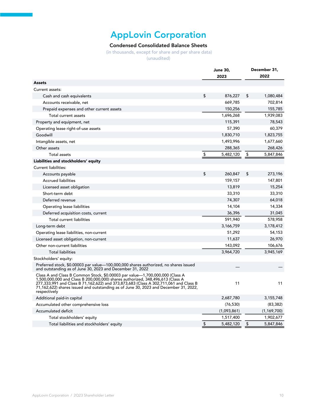 AppLovin Corporation Condensed Consolidated Balance Sheets (in thousands, except for share and per share data) (unaudited) June 30, December 31, 2023 2022 Assets Current assets: Cash and cash equivalents $ 876,227 $ 1,080,484 Accounts receivable, net 669,785 702,814 Prepaid expenses and other current assets 150,256 155,785 Total current assets 1,696,268 1,939,083 Property and equipment, net 115,391 78,543 Operating lease right-of-use assets 57,390 60,379 Goodwill 1,830,710 1,823,755 Intangible assets, net 1,493,996 1,677,660 Other assets 288,365 268,426 Total assets $ 5,482,120 $ 5,847,846 Liabilities and stockholders’ equity Current liabilities: Accounts payable $ 260,847 $ 273,196 Accrued liabilities 159,157 147,801 Licensed asset obligation 13,819 15,254 Short-term debt 33,310 33,310 Deferred revenue 74,307 64,018 Operating lease liabilities 14,104 14,334 Deferred acquisition costs, current 36,396 31,045 Total current liabilities 591,940 578,958 Long-term debt 3,166,759 3,178,412 Operating lease liabilities, non-current 51,292 54,153 Licensed asset obligation, non-current 11,637 26,970 Other non-current liabilities 143,092 106,676 Total liabilities 3,964,720 3,945,169 Stockholders’ equity: Preferred stock, $0.00003 par value—100,000,000 shares authorized, no shares issued and outstanding as of June 30, 2023 and December 31, 2022 — — Class A and Class B Common Stock, $0.00003 par value—1,700,000,000 (Class A 1,500,000,000 and Class B 200,000,000) shares authorized, 348,496,613 (Class A 277,333,991 and Class B 71,162,622) and 373,873,683 (Class A 302,711,061 and Class B 71,162,622) shares issued and outstanding as of June 30, 2023 and December 31, 2022, respectively 11 11 Additional paid-in capital 2,687,780 3,155,748 Accumulated other comprehensive loss (76,530) (83,382) Accumulated deficit (1,093,861) (1,169,700) Total stockholders’ equity 1,517,400 1,902,677 Total liabilities and stockholders’ equity $ 5,482,120 $ 5,847,846 AppLovin Corporation / 2Q23 Shareholder Letter 10
