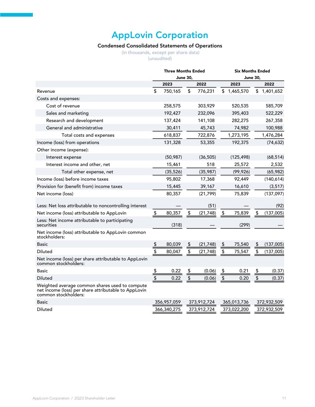 AppLovin Corporation Condensed Consolidated Statements of Operations (in thousands, except per share data) (unaudited) Three Months Ended Six Months Ended June 30, June 30, 2023 2022 2023 2022 Revenue $ 750,165 $ 776,231 $ 1,465,570 $ 1,401,652 Costs and expenses: Cost of revenue 258,575 303,929 520,535 585,709 Sales and marketing 192,427 232,096 395,403 522,229 Research and development 137,424 141,108 282,275 267,358 General and administrative 30,411 45,743 74,982 100,988 Total costs and expenses 618,837 722,876 1,273,195 1,476,284 Income (loss) from operations 131,328 53,355 192,375 (74,632) Other income (expense): Interest expense (50,987) (36,505) (125,498) (68,514) Interest income and other, net 15,461 518 25,572 2,532 Total other expense, net (35,526) (35,987) (99,926) (65,982) Income (loss) before income taxes 95,802 17,368 92,449 (140,614) Provision for (benefit from) income taxes 15,445 39,167 16,610 (3,517) Net income (loss) 80,357 (21,799) 75,839 (137,097) Less: Net loss attributable to noncontrolling interest — (51) — (92) Net income (loss) attributable to AppLovin $ 80,357 $ (21,748) $ 75,839 $ (137,005) Less: Net income attributable to participating securities (318) — (299) — Net income (loss) attributable to AppLovin common stockholders: Basic $ 80,039 $ (21,748) $ 75,540 $ (137,005) Diluted $ 80,047 $ (21,748) $ 75,547 $ (137,005) Net income (loss) per share attributable to AppLovin common stockholders: Basic $ 0.22 $ (0.06) $ 0.21 $ (0.37) Diluted $ 0.22 $ (0.06) $ 0.20 $ (0.37) Weighted average common shares used to compute net income (loss) per share attributable to AppLovin common stockholders: Basic 356,957,059 373,912,724 365,013,736 372,932,509 Diluted 366,340,275 373,912,724 373,022,200 372,932,509 AppLovin Corporation / 2Q23 Shareholder Letter 11