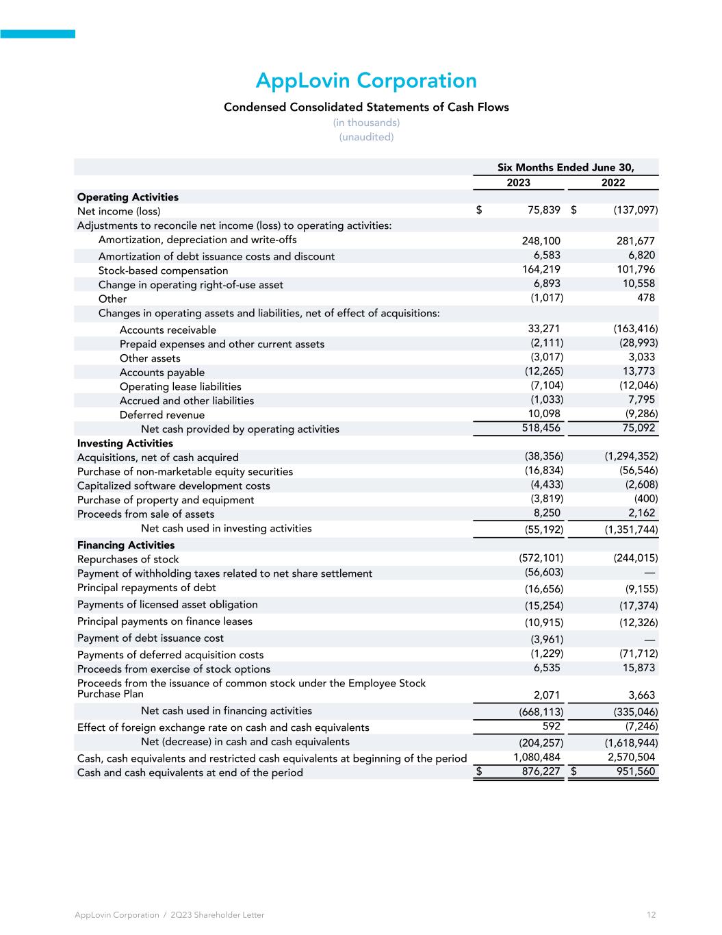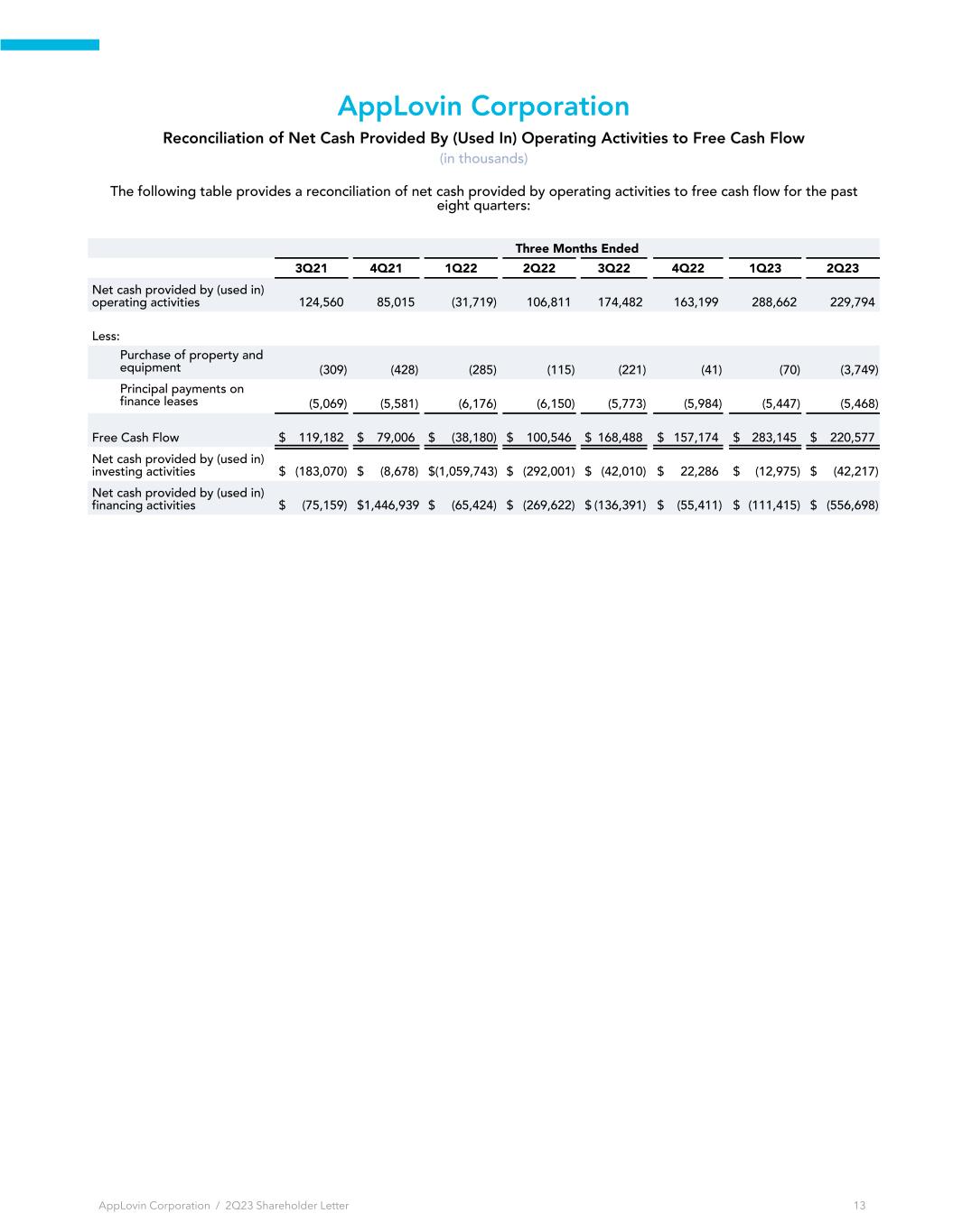 AppLovin Corporation Condensed Consolidated Statements of Cash Flows (in thousands) (unaudited) Six Months Ended June 30, 2023 2022 Operating Activities Net income (loss) $ 75,839 $ (137,097) Adjustments to reconcile net income (loss) to operating activities: Amortization, depreciation and write-offs 248,100 281,677 Amortization of debt issuance costs and discount 6,583 6,820 Stock-based compensation 164,219 101,796 Change in operating right-of-use asset 6,893 10,558 Other (1,017) 478 Changes in operating assets and liabilities, net of effect of acquisitions: Accounts receivable 33,271 (163,416) Prepaid expenses and other current assets (2,111) (28,993) Other assets (3,017) 3,033 Accounts payable (12,265) 13,773 Operating lease liabilities (7,104) (12,046) Accrued and other liabilities (1,033) 7,795 Deferred revenue 10,098 (9,286) Net cash provided by operating activities 518,456 75,092 Investing Activities Acquisitions, net of cash acquired (38,356) (1,294,352) Purchase of non-marketable equity securities (16,834) (56,546) Capitalized software development costs (4,433) (2,608) Purchase of property and equipment (3,819) (400) Proceeds from sale of assets 8,250 2,162 Net cash used in investing activities (55,192) (1,351,744) Financing Activities Repurchases of stock (572,101) (244,015) Payment of withholding taxes related to net share settlement (56,603) — Principal repayments of debt (16,656) (9,155) Payments of licensed asset obligation (15,254) (17,374) Principal payments on finance leases (10,915) (12,326) Payment of debt issuance cost (3,961) — Payments of deferred acquisition costs (1,229) (71,712) Proceeds from exercise of stock options 6,535 15,873 Proceeds from the issuance of common stock under the Employee Stock Purchase Plan 2,071 3,663 Net cash used in financing activities (668,113) (335,046) Effect of foreign exchange rate on cash and cash equivalents 592 (7,246) Net (decrease) in cash and cash equivalents (204,257) (1,618,944) Cash, cash equivalents and restricted cash equivalents at beginning of the period 1,080,484 2,570,504 Cash and cash equivalents at end of the period $ 876,227 $ 951,560 AppLovin Corporation / 2Q23 Shareholder Letter 12
