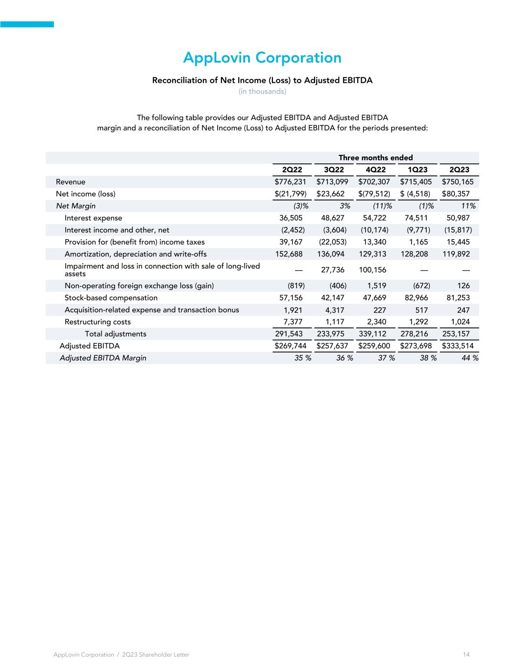 AppLovin Corporation Reconciliation of Net Income (Loss) to Adjusted EBITDA (in thousands) The following table provides our Adjusted EBITDA and Adjusted EBITDA margin and a reconciliation of Net Income (Loss) to Adjusted EBITDA for the periods presented: Three months ended 2Q22 3Q22 4Q22 1Q23 2Q23 Revenue $ 776,231 $ 713,099 $ 702,307 $ 715,405 $ 750,165 Net income (loss) $ (21,799) $ 23,662 $ (79,512) $ (4,518) $ 80,357 Net Margin (3) % 3 % (11) % (1) % 11 % Interest expense 36,505 48,627 54,722 74,511 50,987 Interest income and other, net (2,452) (3,604) (10,174) (9,771) (15,817) Provision for (benefit from) income taxes 39,167 (22,053) 13,340 1,165 15,445 Amortization, depreciation and write-offs 152,688 136,094 129,313 128,208 119,892 Impairment and loss in connection with sale of long-lived assets — 27,736 100,156 — — Non-operating foreign exchange loss (gain) (819) (406) 1,519 (672) 126 Stock-based compensation 57,156 42,147 47,669 82,966 81,253 Acquisition-related expense and transaction bonus 1,921 4,317 227 517 247 Restructuring costs 7,377 1,117 2,340 1,292 1,024 Total adjustments 291,543 233,975 339,112 278,216 253,157 Adjusted EBITDA $ 269,744 $ 257,637 $ 259,600 $ 273,698 $ 333,514 Adjusted EBITDA Margin 35 % 36 % 37 % 38 % 44 % AppLovin Corporation / 2Q23 Shareholder Letter 14