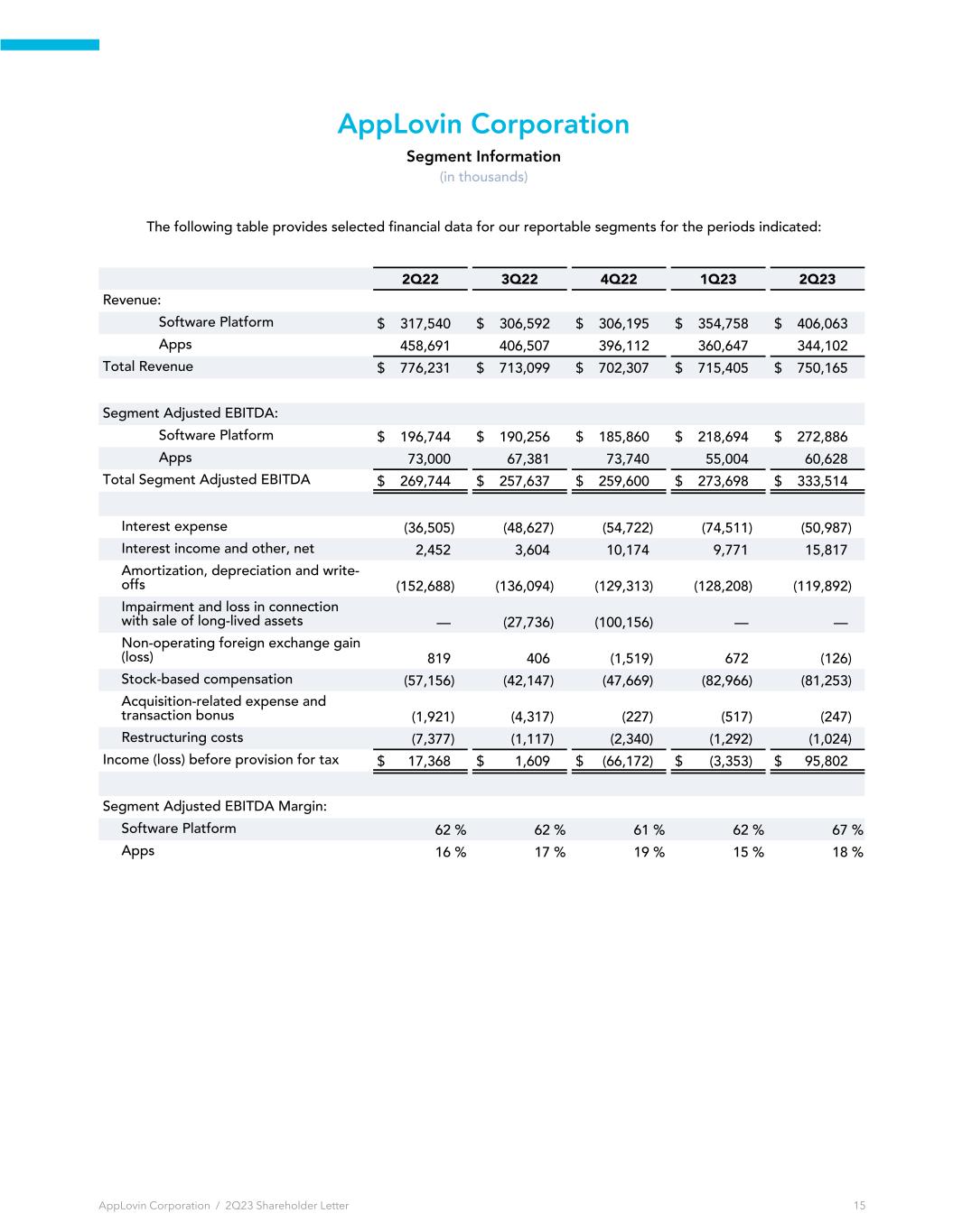 AppLovin Corporation Segment Information (in thousands) The following table provides selected financial data for our reportable segments for the periods indicated: 2Q22 3Q22 4Q22 1Q23 2Q23 Revenue: Software Platform $ 317,540 $ 306,592 $ 306,195 $ 354,758 $ 406,063 Apps 458,691 406,507 396,112 360,647 344,102 Total Revenue $ 776,231 $ 713,099 $ 702,307 $ 715,405 $ 750,165 Segment Adjusted EBITDA: Software Platform $ 196,744 $ 190,256 $ 185,860 $ 218,694 $ 272,886 Apps 73,000 67,381 73,740 55,004 60,628 Total Segment Adjusted EBITDA $ 269,744 $ 257,637 $ 259,600 $ 273,698 $ 333,514 Interest expense (36,505) (48,627) (54,722) (74,511) (50,987) Interest income and other, net 2,452 3,604 10,174 9,771 15,817 Amortization, depreciation and write- offs (152,688) (136,094) (129,313) (128,208) (119,892) Impairment and loss in connection with sale of long-lived assets — (27,736) (100,156) — — Non-operating foreign exchange gain (loss) 819 406 (1,519) 672 (126) Stock-based compensation (57,156) (42,147) (47,669) (82,966) (81,253) Acquisition-related expense and transaction bonus (1,921) (4,317) (227) (517) (247) Restructuring costs (7,377) (1,117) (2,340) (1,292) (1,024) Income (loss) before provision for tax $ 17,368 $ 1,609 $ (66,172) $ (3,353) $ 95,802 Segment Adjusted EBITDA Margin: Software Platform 62 % 62 % 61 % 62 % 67 % Apps 16 % 17 % 19 % 15 % 18 % AppLovin Corporation / 2Q23 Shareholder Letter 15