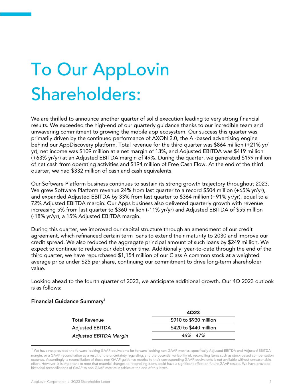 To Our AppLovin Shareholders: We are thrilled to announce another quarter of solid execution leading to very strong financial results. We exceeded the high-end of our quarterly guidance thanks to our incredible team and unwavering commitment to growing the mobile app ecosystem. Our success this quarter was primarily driven by the continued performance of AXON 2.0, the AI-based advertising engine behind our AppDiscovery platform. Total revenue for the third quarter was $864 million (+21% yr/ yr), net income was $109 million at a net margin of 13%, and Adjusted EBITDA was $419 million (+63% yr/yr) at an Adjusted EBITDA margin of 49%. During the quarter, we generated $199 million of net cash from operating activities and $194 million of Free Cash Flow. At the end of the third quarter, we had $332 million of cash and cash equivalents. Our Software Platform business continues to sustain its strong growth trajectory throughout 2023. We grew Software Platform revenue 24% from last quarter to a record $504 million (+65% yr/yr), and expanded Adjusted EBITDA by 33% from last quarter to $364 million (+91% yr/yr), equal to a 72% Adjusted EBITDA margin. Our Apps business also delivered quarterly growth with revenue increasing 5% from last quarter to $360 million (-11% yr/yr) and Adjusted EBITDA of $55 million (-18% yr/yr), a 15% Adjusted EBITDA margin. During this quarter, we improved our capital structure through an amendment of our credit agreement, which refinanced certain term loans to extend their maturity to 2030 and improve our credit spread. We also reduced the aggregate principal amount of such loans by $249 million. We expect to continue to reduce our debt over time. Additionally, year-to-date through the end of the third quarter, we have repurchased $1,154 million of our Class A common stock at a weighted average price under $25 per share, continuing our commitment to drive long-term shareholder value. Looking ahead to the fourth quarter of 2023, we anticipate additional growth. Our 4Q 2023 outlook is as follows: Financial Guidance Summary1 4Q23 Total Revenue $910 to $930 million Adjusted EBITDA $420 to $440 million Adjusted EBITDA Margin 46% - 47% AppLovin Corporation / 3Q23 Shareholder Letter 2 1 We have not provided the forward-looking GAAP equivalents for forward-looking non-GAAP metrics, specifically Adjusted EBITDA and Adjusted EBITDA margin, or a GAAP reconciliation as a result of the uncertainty regarding, and the potential variability of, reconciling items such as stock-based compensation expense. Accordingly, a reconciliation of these non-GAAP guidance metrics to their corresponding GAAP equivalents is not available without unreasonable effort. However, it is important to note that material changes to reconciling items could have a significant effect on future GAAP results. We have provided historical reconciliations of GAAP to non-GAAP metrics in tables at the end of this letter.