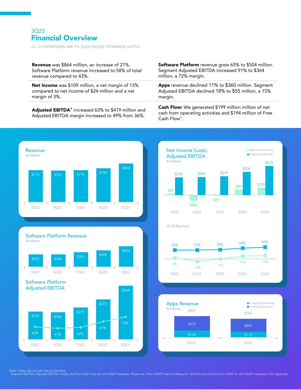 $713 $702 $715 $750 $864 3Q22 4Q22 1Q23 2Q23 3Q23 Revenue ($ millions) $307 $306 $355 $406 $504 3Q22 4Q22 1Q23 2Q23 3Q23 Software Platform Revenue ($ millions) $190 $186 $219 $273 $364 62% 61% 62% 67% 72% 3Q22 4Q22 1Q23 2Q23 3Q23 Software Platform Adjusted EBITDA $24 $(80) $(5) $80 $109 $258 $260 $274 $334 $419 3Q22 4Q22 1Q23 2Q23 3Q23 Net Income (Loss), Adjusted EBITDA ($ millions) Net Income (Loss) Adjusted EBITDA 36% 37% 38% 44% 49% 3% -11% -1% 11% 13% 3Q22 4Q22 1Q23 2Q23 3Q23 As % Revenue $134 $112 $272 $247 $407 $360 3Q22 3Q23 Apps Revenue ($ millions) In-App Advertising In-App Purchases 3Q23 Financial Overview ALL COMPARISONS ARE TO 3Q22 UNLESS OTHERWISE NOTED. Revenue was $864 million, an increase of 21%. Software Platform revenue increased to 58% of total revenue compared to 43%. Software Platform revenue grew 65% to $504 million. Segment Adjusted EBITDA increased 91% to $364 million, a 72% margin. Net Income was $109 million, a net margin of 13% compared to net income of $24 million and a net margin of 3%. Apps revenue declined 11% to $360 million. Segment Adjusted EBITDA declined 18% to $55 million, a 15% margin. Adjusted EBITDA1 increased 63% to $419 million and Adjusted EBITDA margin increased to 49% from 36%. Cash Flow: We generated $199 million million of net cash from operating activities and $194 million of Free Cash Flow1. Note: Totals may not sum due to rounding 1 Adjusted EBITDA, Adjusted EBITDA margin, and Free Cash Flow are non-GAAP measures. Please see “Non-GAAP Financial Measures” and the reconciliation from GAAP to non-GAAP measures in the Appendix.