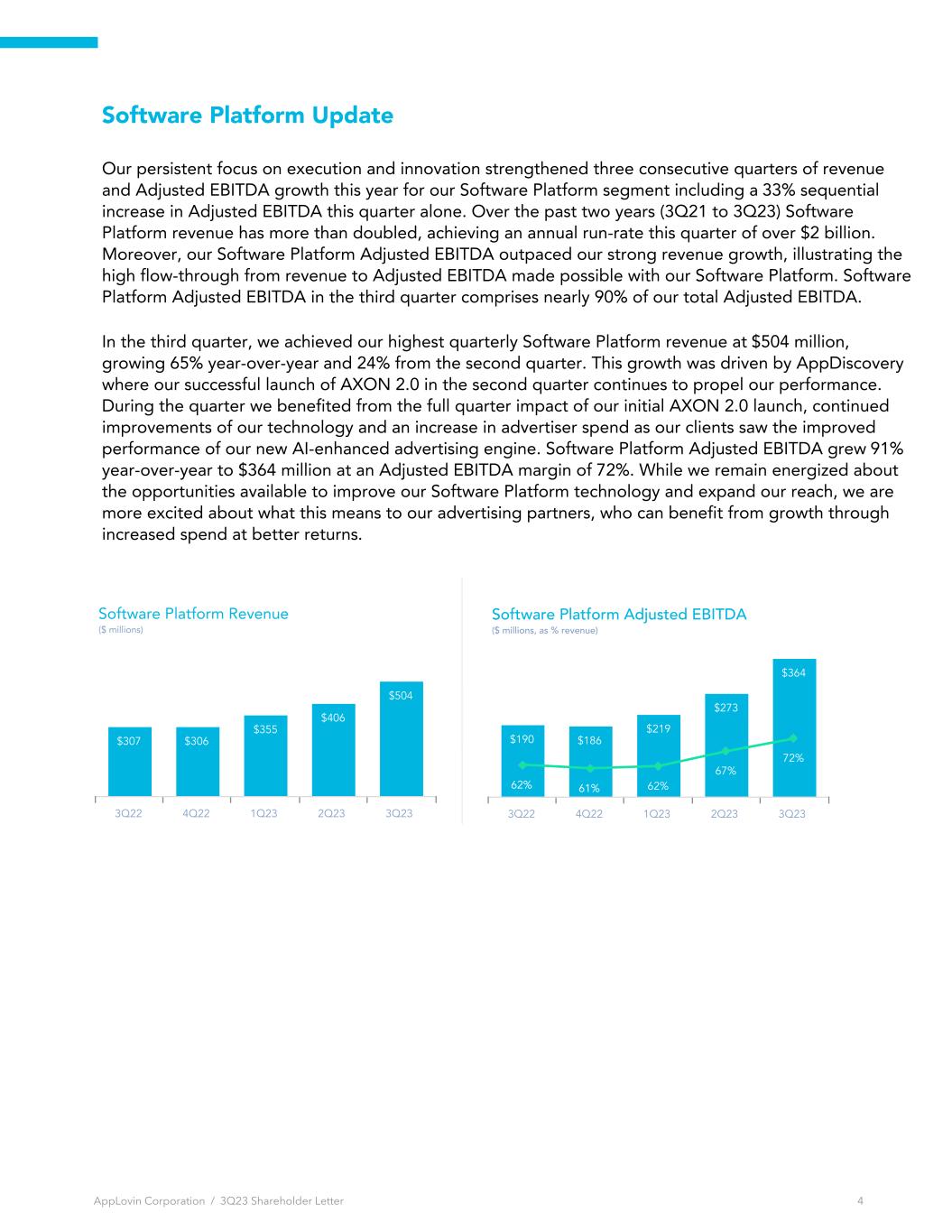 Software Platform Update Our persistent focus on execution and innovation strengthened three consecutive quarters of revenue and Adjusted EBITDA growth this year for our Software Platform segment including a 33% sequential increase in Adjusted EBITDA this quarter alone. Over the past two years (3Q21 to 3Q23) Software Platform revenue has more than doubled, achieving an annual run-rate this quarter of over $2 billion. Moreover, our Software Platform Adjusted EBITDA outpaced our strong revenue growth, illustrating the high flow-through from revenue to Adjusted EBITDA made possible with our Software Platform. Software Platform Adjusted EBITDA in the third quarter comprises nearly 90% of our total Adjusted EBITDA. In the third quarter, we achieved our highest quarterly Software Platform revenue at $504 million, growing 65% year-over-year and 24% from the second quarter. This growth was driven by AppDiscovery where our successful launch of AXON 2.0 in the second quarter continues to propel our performance. During the quarter we benefited from the full quarter impact of our initial AXON 2.0 launch, continued improvements of our technology and an increase in advertiser spend as our clients saw the improved performance of our new AI-enhanced advertising engine. Software Platform Adjusted EBITDA grew 91% year-over-year to $364 million at an Adjusted EBITDA margin of 72%. While we remain energized about the opportunities available to improve our Software Platform technology and expand our reach, we are more excited about what this means to our advertising partners, who can benefit from growth through increased spend at better returns. $307 $306 $355 $406 $504 3Q22 4Q22 1Q23 2Q23 3Q23 Software Platform Revenue ($ millions) $190 $186 $219 $273 $364 62% 61% 62% 67% 72% 3Q22 4Q22 1Q23 2Q23 3Q23 Software Platform Adjusted EBITDA ($ millions, as % revenue) AppLovin Corporation / 3Q23 Shareholder Letter 4