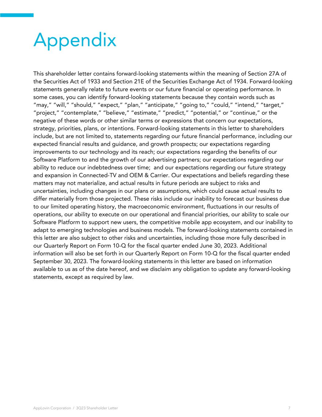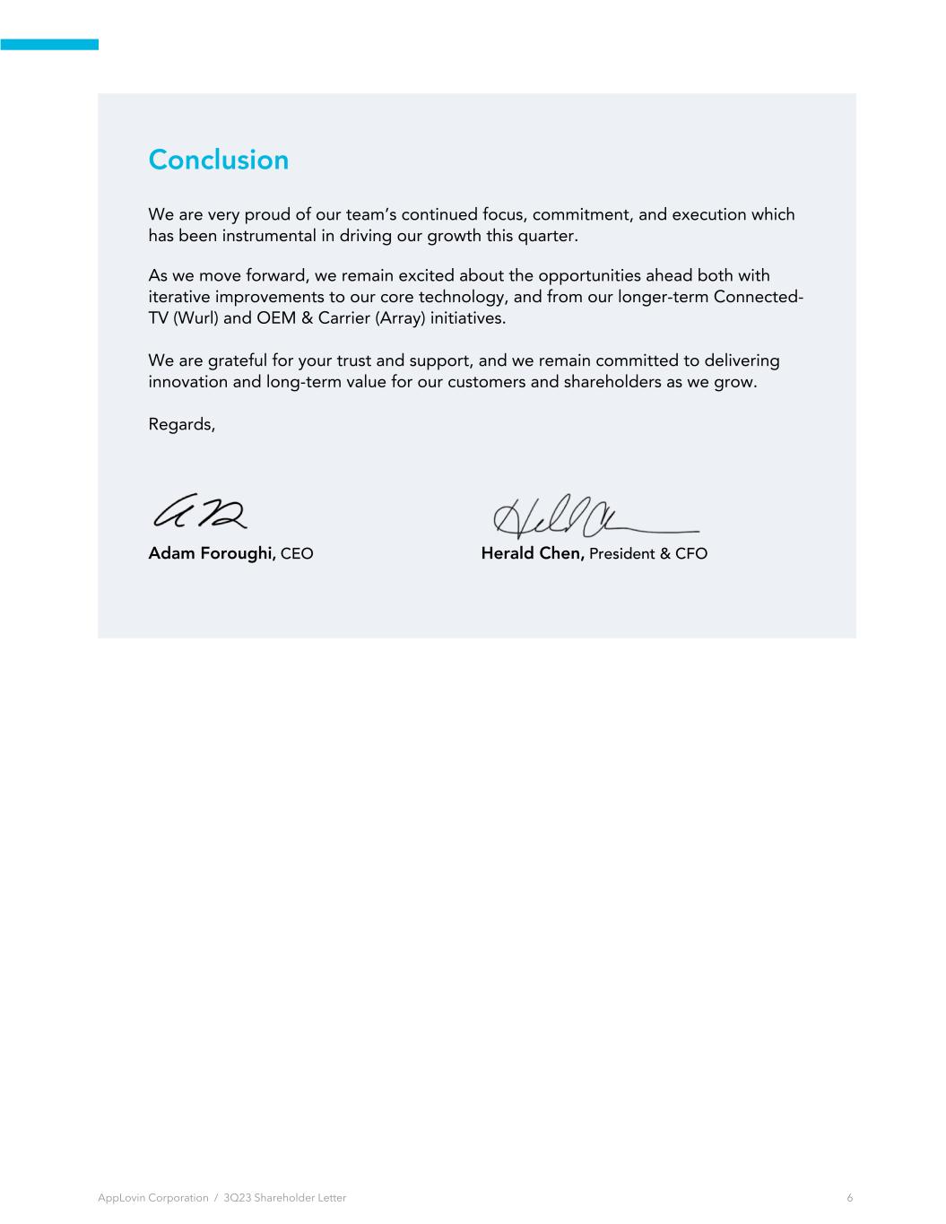 Conclusion We are very proud of our team’s continued focus, commitment, and execution which has been instrumental in driving our growth this quarter. As we move forward, we remain excited about the opportunities ahead both with iterative improvements to our core technology, and from our longer-term Connected- TV (Wurl) and OEM & Carrier (Array) initiatives. We are grateful for your trust and support, and we remain committed to delivering innovation and long-term value for our customers and shareholders as we grow. Regards, Adam Foroughi, CEO Herald Chen, President & CFO AppLovin Corporation / 3Q23 Shareholder Letter 6