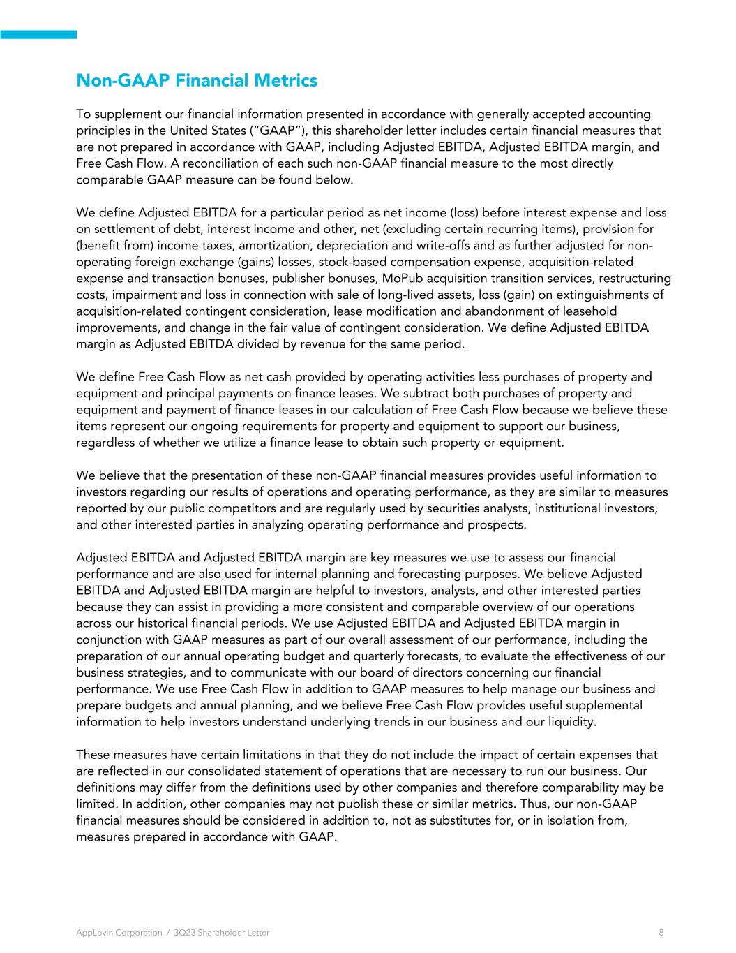 Non-GAAP Financial Metrics To supplement our financial information presented in accordance with generally accepted accounting principles in the United States (“GAAP”), this shareholder letter includes certain financial measures that are not prepared in accordance with GAAP, including Adjusted EBITDA, Adjusted EBITDA margin, and Free Cash Flow. A reconciliation of each such non-GAAP financial measure to the most directly comparable GAAP measure can be found below. We define Adjusted EBITDA for a particular period as net income (loss) before interest expense and loss on settlement of debt, interest income and other, net (excluding certain recurring items), provision for (benefit from) income taxes, amortization, depreciation and write-offs and as further adjusted for non- operating foreign exchange (gains) losses, stock-based compensation expense, acquisition-related expense and transaction bonuses, publisher bonuses, MoPub acquisition transition services, restructuring costs, impairment and loss in connection with sale of long-lived assets, loss (gain) on extinguishments of acquisition-related contingent consideration, lease modification and abandonment of leasehold improvements, and change in the fair value of contingent consideration. We define Adjusted EBITDA margin as Adjusted EBITDA divided by revenue for the same period. We define Free Cash Flow as net cash provided by operating activities less purchases of property and equipment and principal payments on finance leases. We subtract both purchases of property and equipment and payment of finance leases in our calculation of Free Cash Flow because we believe these items represent our ongoing requirements for property and equipment to support our business, regardless of whether we utilize a finance lease to obtain such property or equipment. We believe that the presentation of these non-GAAP financial measures provides useful information to investors regarding our results of operations and operating performance, as they are similar to measures reported by our public competitors and are regularly used by securities analysts, institutional investors, and other interested parties in analyzing operating performance and prospects. Adjusted EBITDA and Adjusted EBITDA margin are key measures we use to assess our financial performance and are also used for internal planning and forecasting purposes. We believe Adjusted EBITDA and Adjusted EBITDA margin are helpful to investors, analysts, and other interested parties because they can assist in providing a more consistent and comparable overview of our operations across our historical financial periods. We use Adjusted EBITDA and Adjusted EBITDA margin in conjunction with GAAP measures as part of our overall assessment of our performance, including the preparation of our annual operating budget and quarterly forecasts, to evaluate the effectiveness of our business strategies, and to communicate with our board of directors concerning our financial performance. We use Free Cash Flow in addition to GAAP measures to help manage our business and prepare budgets and annual planning, and we believe Free Cash Flow provides useful supplemental information to help investors understand underlying trends in our business and our liquidity. These measures have certain limitations in that they do not include the impact of certain expenses that are reflected in our consolidated statement of operations that are necessary to run our business. Our definitions may differ from the definitions used by other companies and therefore comparability may be limited. In addition, other companies may not publish these or similar metrics. Thus, our non-GAAP financial measures should be considered in addition to, not as substitutes for, or in isolation from, measures prepared in accordance with GAAP. AppLovin Corporation / 3Q23 Shareholder Letter 8