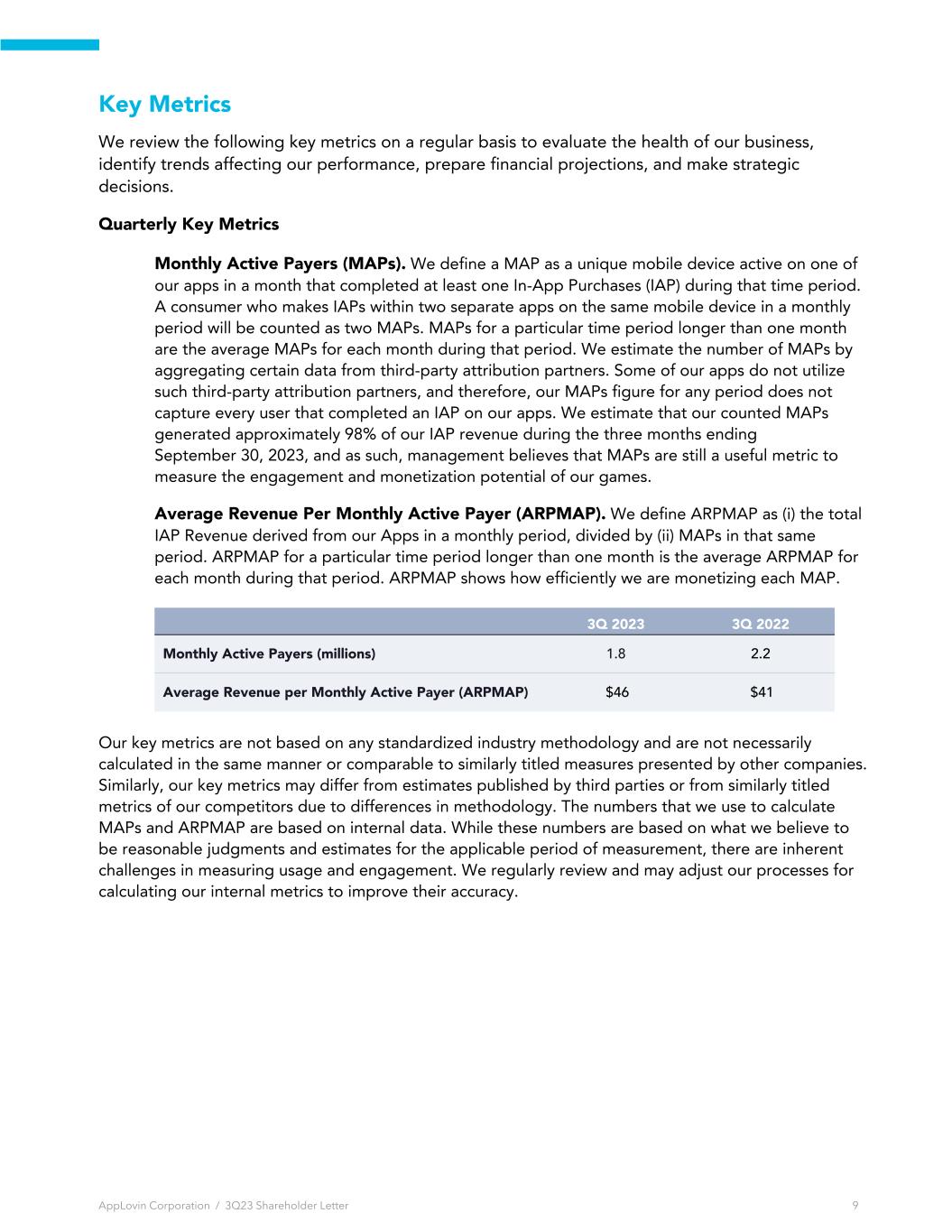 Key Metrics We review the following key metrics on a regular basis to evaluate the health of our business, identify trends affecting our performance, prepare financial projections, and make strategic decisions. Quarterly Key Metrics Monthly Active Payers (MAPs). We define a MAP as a unique mobile device active on one of our apps in a month that completed at least one In-App Purchases (IAP) during that time period. A consumer who makes IAPs within two separate apps on the same mobile device in a monthly period will be counted as two MAPs. MAPs for a particular time period longer than one month are the average MAPs for each month during that period. We estimate the number of MAPs by aggregating certain data from third-party attribution partners. Some of our apps do not utilize such third-party attribution partners, and therefore, our MAPs figure for any period does not capture every user that completed an IAP on our apps. We estimate that our counted MAPs generated approximately 98% of our IAP revenue during the three months ending September 30, 2023, and as such, management believes that MAPs are still a useful metric to measure the engagement and monetization potential of our games. Average Revenue Per Monthly Active Payer (ARPMAP). We define ARPMAP as (i) the total IAP Revenue derived from our Apps in a monthly period, divided by (ii) MAPs in that same period. ARPMAP for a particular time period longer than one month is the average ARPMAP for each month during that period. ARPMAP shows how efficiently we are monetizing each MAP. 3Q 2023 3Q 2022 Monthly Active Payers (millions) 1.8 2.2 Average Revenue per Monthly Active Payer (ARPMAP) $46 $41 Our key metrics are not based on any standardized industry methodology and are not necessarily calculated in the same manner or comparable to similarly titled measures presented by other companies. Similarly, our key metrics may differ from estimates published by third parties or from similarly titled metrics of our competitors due to differences in methodology. The numbers that we use to calculate MAPs and ARPMAP are based on internal data. While these numbers are based on what we believe to be reasonable judgments and estimates for the applicable period of measurement, there are inherent challenges in measuring usage and engagement. We regularly review and may adjust our processes for calculating our internal metrics to improve their accuracy. AppLovin Corporation / 3Q23 Shareholder Letter 9