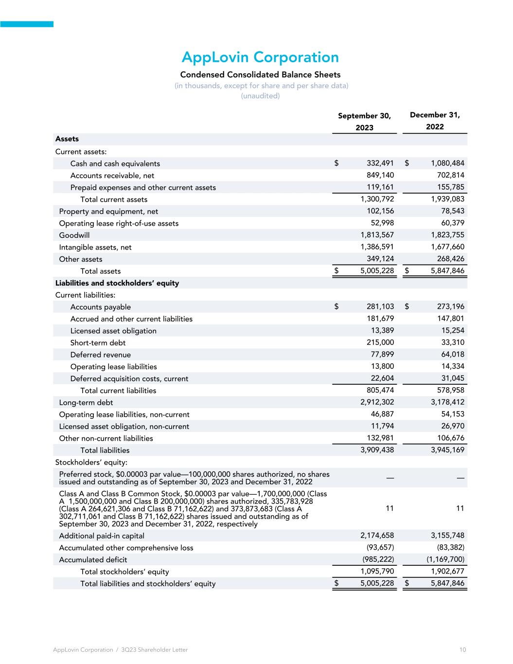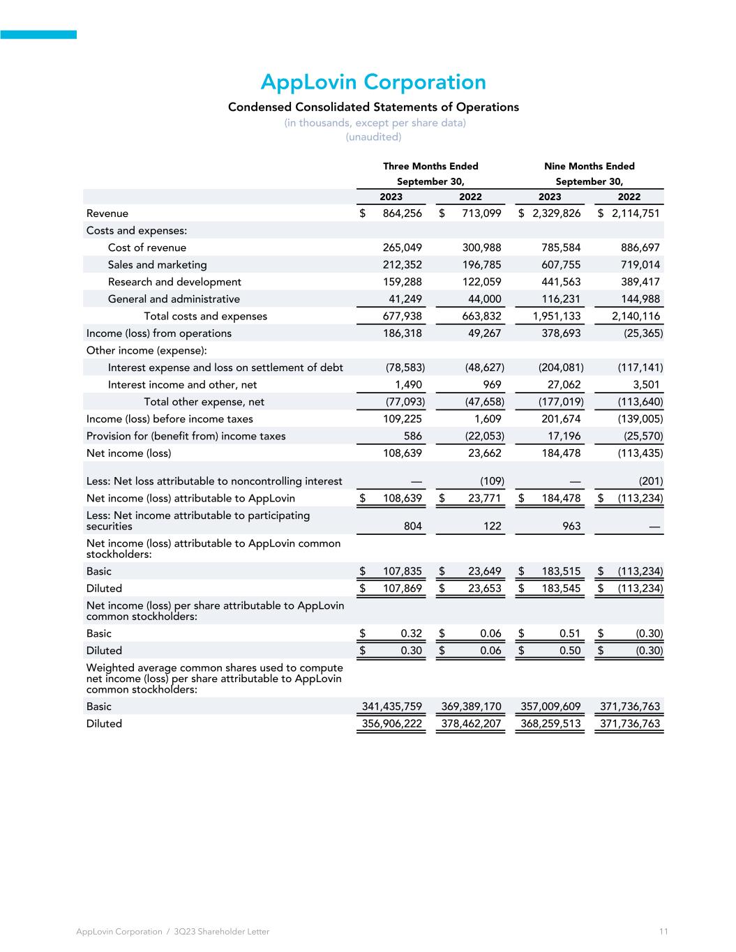 AppLovin Corporation Condensed Consolidated Balance Sheets (in thousands, except for share and per share data) (unaudited) September 30, December 31, 2023 2022 Assets Current assets: Cash and cash equivalents $ 332,491 $ 1,080,484 Accounts receivable, net 849,140 702,814 Prepaid expenses and other current assets 119,161 155,785 Total current assets 1,300,792 1,939,083 Property and equipment, net 102,156 78,543 Operating lease right-of-use assets 52,998 60,379 Goodwill 1,813,567 1,823,755 Intangible assets, net 1,386,591 1,677,660 Other assets 349,124 268,426 Total assets $ 5,005,228 $ 5,847,846 Liabilities and stockholders’ equity Current liabilities: Accounts payable $ 281,103 $ 273,196 Accrued and other current liabilities 181,679 147,801 Licensed asset obligation 13,389 15,254 Short-term debt 215,000 33,310 Deferred revenue 77,899 64,018 Operating lease liabilities 13,800 14,334 Deferred acquisition costs, current 22,604 31,045 Total current liabilities 805,474 578,958 Long-term debt 2,912,302 3,178,412 Operating lease liabilities, non-current 46,887 54,153 Licensed asset obligation, non-current 11,794 26,970 Other non-current liabilities 132,981 106,676 Total liabilities 3,909,438 3,945,169 Stockholders’ equity: Preferred stock, $0.00003 par value—100,000,000 shares authorized, no shares issued and outstanding as of September 30, 2023 and December 31, 2022 — — Class A and Class B Common Stock, $0.00003 par value—1,700,000,000 (Class A 1,500,000,000 and Class B 200,000,000) shares authorized, 335,783,928 (Class A 264,621,306 and Class B 71,162,622) and 373,873,683 (Class A 302,711,061 and Class B 71,162,622) shares issued and outstanding as of September 30, 2023 and December 31, 2022, respectively 11 11 Additional paid-in capital 2,174,658 3,155,748 Accumulated other comprehensive loss (93,657) (83,382) Accumulated deficit (985,222) (1,169,700) Total stockholders’ equity 1,095,790 1,902,677 Total liabilities and stockholders’ equity $ 5,005,228 $ 5,847,846 AppLovin Corporation / 3Q23 Shareholder Letter 10