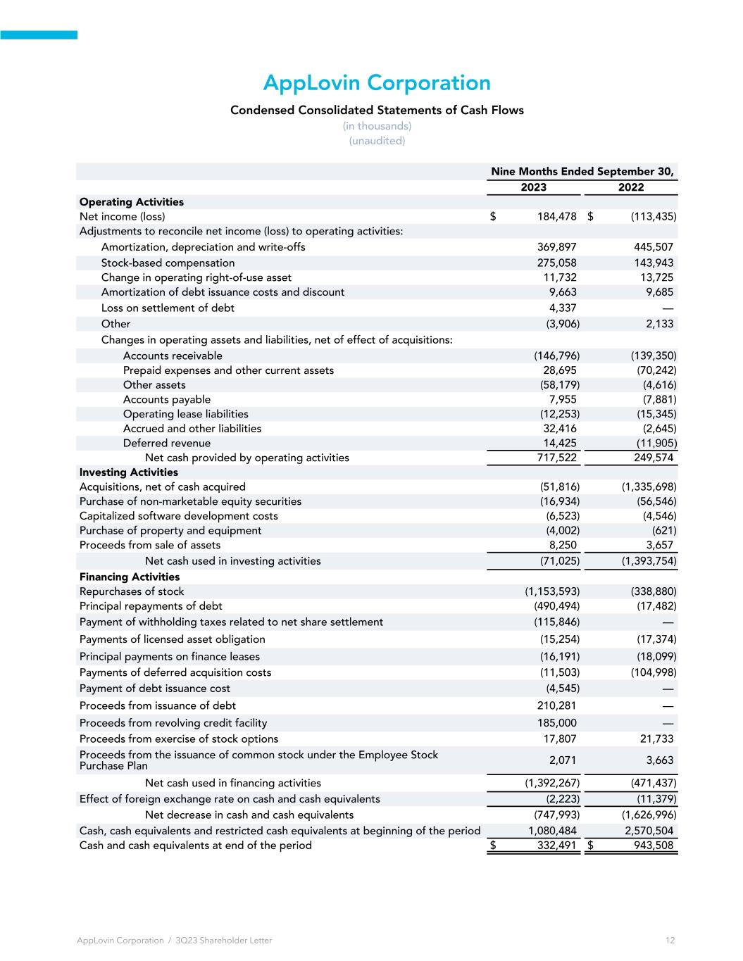 AppLovin Corporation Condensed Consolidated Statements of Cash Flows (in thousands) (unaudited) Nine Months Ended September 30, 2023 2022 Operating Activities Net income (loss) $ 184,478 $ (113,435) Adjustments to reconcile net income (loss) to operating activities: Amortization, depreciation and write-offs 369,897 445,507 Stock-based compensation 275,058 143,943 Change in operating right-of-use asset 11,732 13,725 Amortization of debt issuance costs and discount 9,663 9,685 Loss on settlement of debt 4,337 — Other (3,906) 2,133 Changes in operating assets and liabilities, net of effect of acquisitions: Accounts receivable (146,796) (139,350) Prepaid expenses and other current assets 28,695 (70,242) Other assets (58,179) (4,616) Accounts payable 7,955 (7,881) Operating lease liabilities (12,253) (15,345) Accrued and other liabilities 32,416 (2,645) Deferred revenue 14,425 (11,905) Net cash provided by operating activities 717,522 249,574 Investing Activities Acquisitions, net of cash acquired (51,816) (1,335,698) Purchase of non-marketable equity securities (16,934) (56,546) Capitalized software development costs (6,523) (4,546) Purchase of property and equipment (4,002) (621) Proceeds from sale of assets 8,250 3,657 Net cash used in investing activities (71,025) (1,393,754) Financing Activities Repurchases of stock (1,153,593) (338,880) Principal repayments of debt (490,494) (17,482) Payment of withholding taxes related to net share settlement (115,846) — Payments of licensed asset obligation (15,254) (17,374) Principal payments on finance leases (16,191) (18,099) Payments of deferred acquisition costs (11,503) (104,998) Payment of debt issuance cost (4,545) — Proceeds from issuance of debt 210,281 — Proceeds from revolving credit facility 185,000 — Proceeds from exercise of stock options 17,807 21,733 Proceeds from the issuance of common stock under the Employee Stock Purchase Plan 2,071 3,663 Net cash used in financing activities (1,392,267) (471,437) Effect of foreign exchange rate on cash and cash equivalents (2,223) (11,379) Net decrease in cash and cash equivalents (747,993) (1,626,996) Cash, cash equivalents and restricted cash equivalents at beginning of the period 1,080,484 2,570,504 Cash and cash equivalents at end of the period $ 332,491 $ 943,508 AppLovin Corporation / 3Q23 Shareholder Letter 12