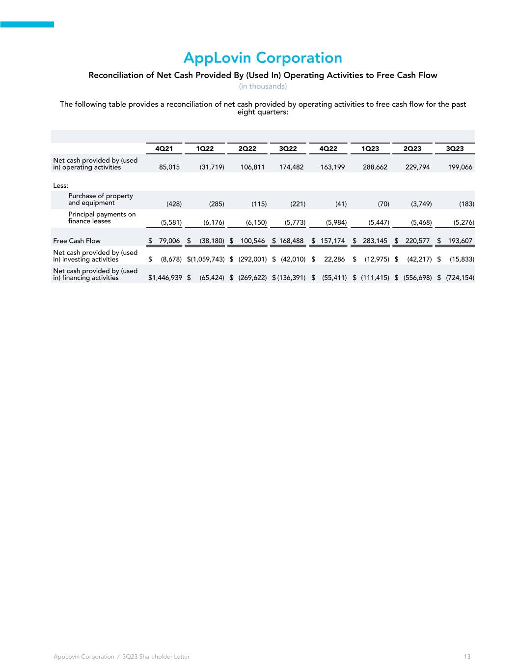 AppLovin Corporation Reconciliation of Net Cash Provided By (Used In) Operating Activities to Free Cash Flow (in thousands) The following table provides a reconciliation of net cash provided by operating activities to free cash flow for the past eight quarters: 4Q21 1Q22 2Q22 3Q22 4Q22 1Q23 2Q23 3Q23 Net cash provided by (used in) operating activities 85,015 (31,719) 106,811 174,482 163,199 288,662 229,794 199,066 Less: Purchase of property and equipment (428) (285) (115) (221) (41) (70) (3,749) (183) Principal payments on finance leases (5,581) (6,176) (6,150) (5,773) (5,984) (5,447) (5,468) (5,276) Free Cash Flow $ 79,006 $ (38,180) $ 100,546 $ 168,488 $ 157,174 $ 283,145 $ 220,577 $ 193,607 Net cash provided by (used in) investing activities $ (8,678) $ (1,059,743) $ (292,001) $ (42,010) $ 22,286 $ (12,975) $ (42,217) $ (15,833) Net cash provided by (used in) financing activities $ 1,446,939 $ (65,424) $ (269,622) $ (136,391) $ (55,411) $ (111,415) $ (556,698) $ (724,154) AppLovin Corporation / 3Q23 Shareholder Letter 13