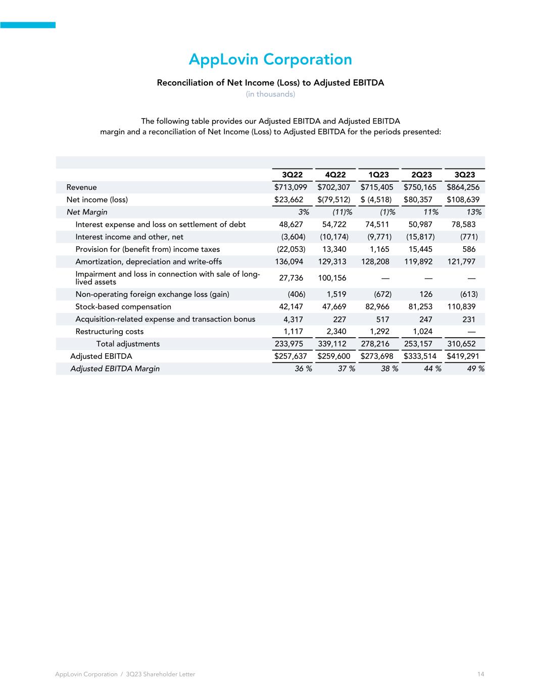 AppLovin Corporation Reconciliation of Net Income (Loss) to Adjusted EBITDA (in thousands) The following table provides our Adjusted EBITDA and Adjusted EBITDA margin and a reconciliation of Net Income (Loss) to Adjusted EBITDA for the periods presented: 3Q22 4Q22 1Q23 2Q23 3Q23 Revenue $ 713,099 $ 702,307 $ 715,405 $ 750,165 $ 864,256 Net income (loss) $ 23,662 $ (79,512) $ (4,518) $ 80,357 $ 108,639 Net Margin 3 % (11) % (1) % 11 % 13 % Interest expense and loss on settlement of debt 48,627 54,722 74,511 50,987 78,583 Interest income and other, net (3,604) (10,174) (9,771) (15,817) (771) Provision for (benefit from) income taxes (22,053) 13,340 1,165 15,445 586 Amortization, depreciation and write-offs 136,094 129,313 128,208 119,892 121,797 Impairment and loss in connection with sale of long- lived assets 27,736 100,156 — — — Non-operating foreign exchange loss (gain) (406) 1,519 (672) 126 (613) Stock-based compensation 42,147 47,669 82,966 81,253 110,839 Acquisition-related expense and transaction bonus 4,317 227 517 247 231 Restructuring costs 1,117 2,340 1,292 1,024 — Total adjustments 233,975 339,112 278,216 253,157 310,652 Adjusted EBITDA $ 257,637 $ 259,600 $ 273,698 $ 333,514 $ 419,291 Adjusted EBITDA Margin 36 % 37 % 38 % 44 % 49 % AppLovin Corporation / 3Q23 Shareholder Letter 14