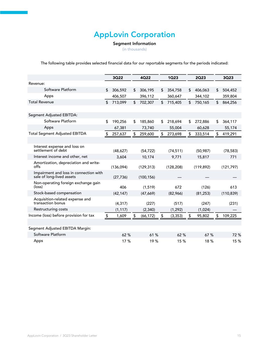 AppLovin Corporation Segment Information (in thousands) The following table provides selected financial data for our reportable segments for the periods indicated: 3Q22 4Q22 1Q23 2Q23 3Q23 Revenue: Software Platform $ 306,592 $ 306,195 $ 354,758 $ 406,063 $ 504,452 Apps 406,507 396,112 360,647 344,102 359,804 Total Revenue $ 713,099 $ 702,307 $ 715,405 $ 750,165 $ 864,256 Segment Adjusted EBITDA: Software Platform $ 190,256 $ 185,860 $ 218,694 $ 272,886 $ 364,117 Apps 67,381 73,740 55,004 60,628 55,174 Total Segment Adjusted EBITDA $ 257,637 $ 259,600 $ 273,698 $ 333,514 $ 419,291 Interest expense and loss on settlement of debt (48,627) (54,722) (74,511) (50,987) (78,583) Interest income and other, net 3,604 10,174 9,771 15,817 771 Amortization, depreciation and write- offs (136,094) (129,313) (128,208) (119,892) (121,797) Impairment and loss in connection with sale of long-lived assets (27,736) (100,156) — — — Non-operating foreign exchange gain (loss) 406 (1,519) 672 (126) 613 Stock-based compensation (42,147) (47,669) (82,966) (81,253) (110,839) Acquisition-related expense and transaction bonus (4,317) (227) (517) (247) (231) Restructuring costs (1,117) (2,340) (1,292) (1,024) — Income (loss) before provision for tax $ 1,609 $ (66,172) $ (3,353) $ 95,802 $ 109,225 Segment Adjusted EBITDA Margin: Software Platform 62 % 61 % 62 % 67 % 72 % Apps 17 % 19 % 15 % 18 % 15 % AppLovin Corporation / 3Q23 Shareholder Letter 15