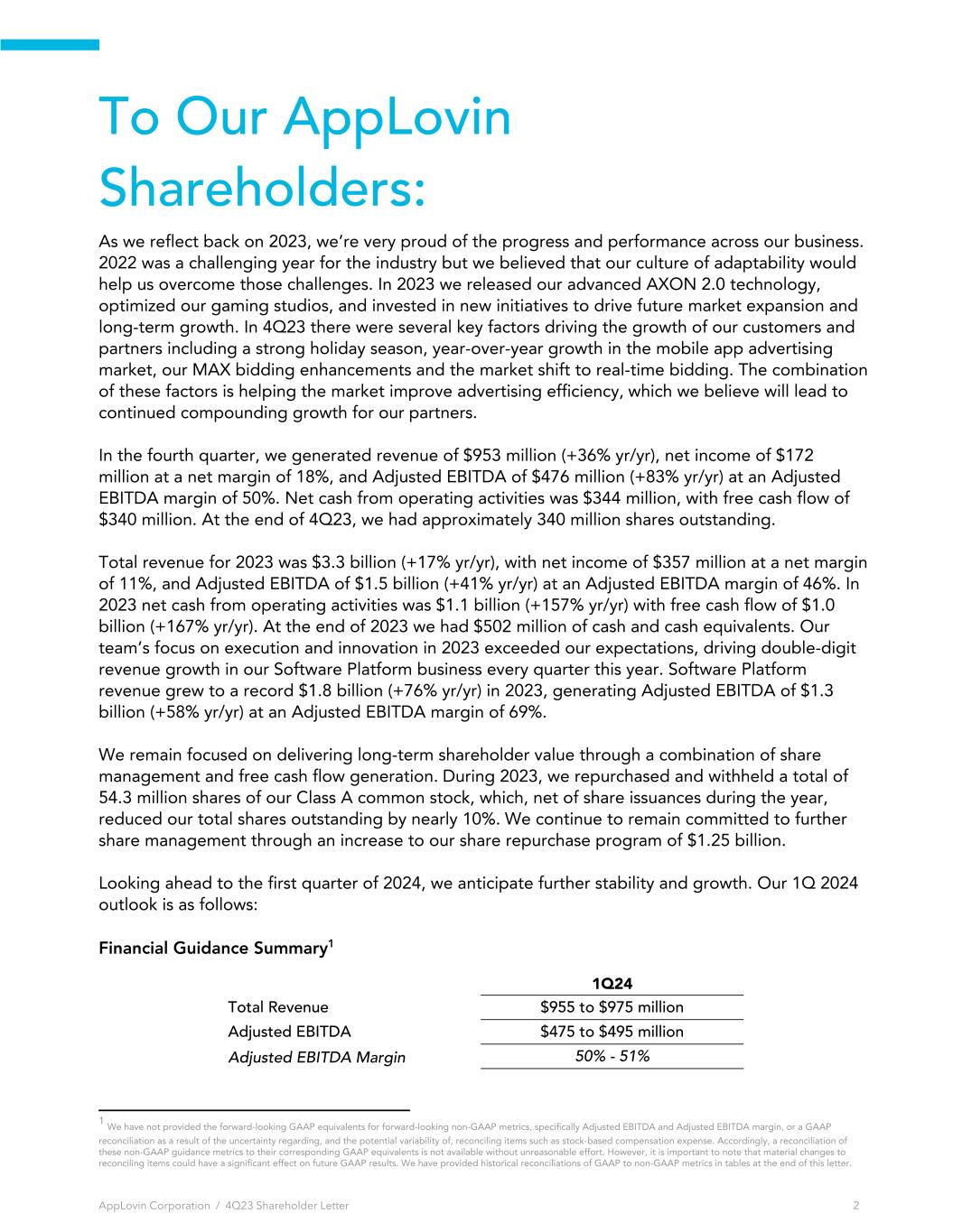 To Our AppLovin Shareholders: As we reflect back on 2023, we’re very proud of the progress and performance across our business. 2022 was a challenging year for the industry but we believed that our culture of adaptability would help us overcome those challenges. In 2023 we released our advanced AXON 2.0 technology, optimized our gaming studios, and invested in new initiatives to drive future market expansion and long-term growth. In 4Q23 there were several key factors driving the growth of our customers and partners including a strong holiday season, year-over-year growth in the mobile app advertising market, our MAX bidding enhancements and the market shift to real-time bidding. The combination of these factors is helping the market improve advertising efficiency, which we believe will lead to continued compounding growth for our partners. In the fourth quarter, we generated revenue of $953 million (+36% yr/yr), net income of $172 million at a net margin of 18%, and Adjusted EBITDA of $476 million (+83% yr/yr) at an Adjusted EBITDA margin of 50%. Net cash from operating activities was $344 million, with free cash flow of $340 million. At the end of 4Q23, we had approximately 340 million shares outstanding. Total revenue for 2023 was $3.3 billion (+17% yr/yr), with net income of $357 million at a net margin of 11%, and Adjusted EBITDA of $1.5 billion (+41% yr/yr) at an Adjusted EBITDA margin of 46%. In 2023 net cash from operating activities was $1.1 billion (+157% yr/yr) with free cash flow of $1.0 billion (+167% yr/yr). At the end of 2023 we had $502 million of cash and cash equivalents. Our team’s focus on execution and innovation in 2023 exceeded our expectations, driving double-digit revenue growth in our Software Platform business every quarter this year. Software Platform revenue grew to a record $1.8 billion (+76% yr/yr) in 2023, generating Adjusted EBITDA of $1.3 billion (+58% yr/yr) at an Adjusted EBITDA margin of 69%. We remain focused on delivering long-term shareholder value through a combination of share management and free cash flow generation. During 2023, we repurchased and withheld a total of 54.3 million shares of our Class A common stock, which, net of share issuances during the year, reduced our total shares outstanding by nearly 10%. We continue to remain committed to further share management through an increase to our share repurchase program of $1.25 billion. Looking ahead to the first quarter of 2024, we anticipate further stability and growth. Our 1Q 2024 outlook is as follows: Financial Guidance Summary1 1Q24 Total Revenue $955 to $975 million Adjusted EBITDA $475 to $495 million Adjusted EBITDA Margin 50% - 51% AppLovin Corporation / 4Q23 Shareholder Letter 2 1 We have not provided the forward-looking GAAP equivalents for forward-looking non-GAAP metrics, specifically Adjusted EBITDA and Adjusted EBITDA margin, or a GAAP reconciliation as a result of the uncertainty regarding, and the potential variability of, reconciling items such as stock-based compensation expense. Accordingly, a reconciliation of these non-GAAP guidance metrics to their corresponding GAAP equivalents is not available without unreasonable effort. However, it is important to note that material changes to reconciling items could have a significant effect on future GAAP results. We have provided historical reconciliations of GAAP to non-GAAP metrics in tables at the end of this letter.