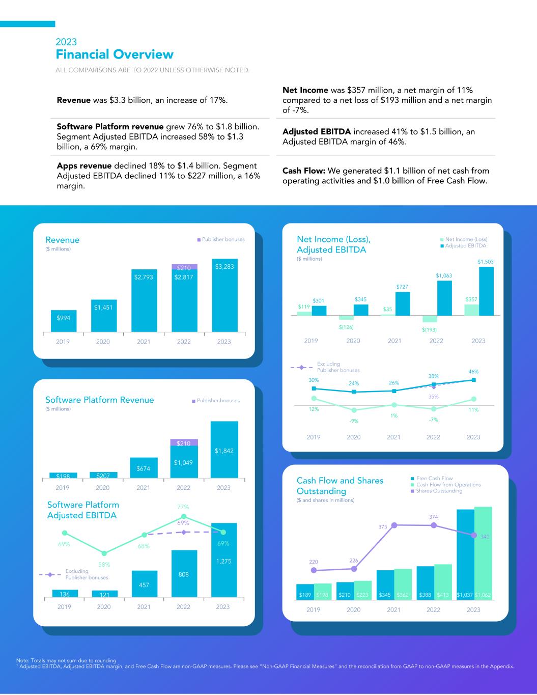 $994 $1,451 $2,793 $2,817 $3,283$210 2019 2020 2021 2022 2023 Revenue ($ millions) $198 $207 $674 $1,049 $1,842 $210 2019 2020 2021 2022 2023 Software Platform Revenue ($ millions) 136 121 457 808 1,275 69% 58% 68% 69% 69% 77% 2019 2020 2021 2022 2023 Software Platform Adjusted EBITDA $119 $(126) $35 $(193) $357$301 $345 $727 $1,063 $1,503 2019 2020 2021 2022 2023 Net Income (Loss), Adjusted EBITDA ($ millions) Cash Flow and Shares Outstanding ($ and shares in millions) $189 $210 $345 $388 $1,037$198 $223 $362 $413 $1,062 220 226 375 374 340 2019 2020 2021 2022 2023 2023 Financial Overview ALL COMPARISONS ARE TO 2022 UNLESS OTHERWISE NOTED. Revenue was $3.3 billion, an increase of 17%. Net Income was $357 million, a net margin of 11% compared to a net loss of $193 million and a net margin of -7%. Software Platform revenue grew 76% to $1.8 billion. Segment Adjusted EBITDA increased 58% to $1.3 billion, a 69% margin. Adjusted EBITDA increased 41% to $1.5 billion, an Adjusted EBITDA margin of 46%. Apps revenue declined 18% to $1.4 billion. Segment Adjusted EBITDA declined 11% to $227 million, a 16% margin. Cash Flow: We generated $1.1 billion of net cash from operating activities and $1.0 billion of Free Cash Flow. Note: Totals may not sum due to rounding 1 Adjusted EBITDA, Adjusted EBITDA margin, and Free Cash Flow are non-GAAP measures. Please see “Non-GAAP Financial Measures” and the reconciliation from GAAP to non-GAAP measures in the Appendix. Cash Flow from Operations Free Cash Flow Net Income (Loss) Shares Outstanding Adjusted EBITDA Excluding Publisher bonuses 35% 30% 24% 26% 38% 46% 12% -9% 1% -7% 11% 2019 2020 2021 2022 2023 Excluding Publisher bonuses Publisher bonuses Publisher bonuses