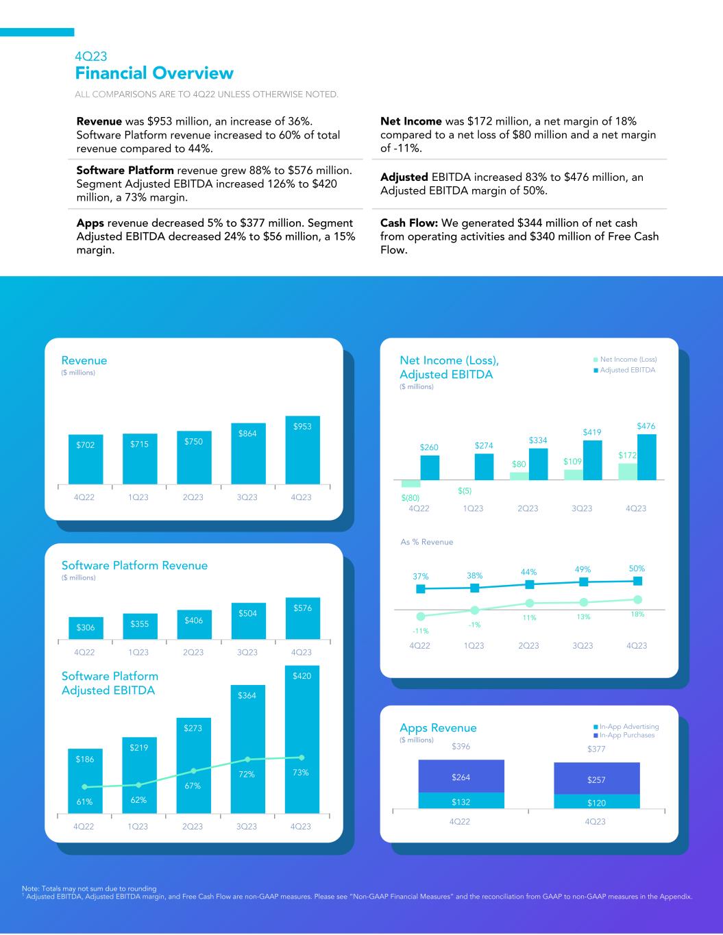 $702 $715 $750 $864 $953 4Q22 1Q23 2Q23 3Q23 4Q23 Revenue ($ millions) $306 $355 $406 $504 $576 4Q22 1Q23 2Q23 3Q23 4Q23 Software Platform Revenue ($ millions) $186 $219 $273 $364 $420 61% 62% 67% 72% 73% 4Q22 1Q23 2Q23 3Q23 4Q23 Software Platform Adjusted EBITDA $(80) $(5) $80 $109 $172 $260 $274 $334 $419 $476 4Q22 1Q23 2Q23 3Q23 4Q23 Net Income (Loss), Adjusted EBITDA ($ millions) Net Income (Loss) Adjusted EBITDA 37% 38% 44% 49% 50% -11% -1% 11% 13% 18% 4Q22 1Q23 2Q23 3Q23 4Q23 As % Revenue $132 $120 $264 $257 $396 $377 4Q22 4Q23 Apps Revenue ($ millions) In-App Advertising In-App Purchases 4Q23 Financial Overview ALL COMPARISONS ARE TO 4Q22 UNLESS OTHERWISE NOTED. Revenue was $953 million, an increase of 36%. Software Platform revenue increased to 60% of total revenue compared to 44%. Net Income was $172 million, a net margin of 18% compared to a net loss of $80 million and a net margin of -11%. Software Platform revenue grew 88% to $576 million. Segment Adjusted EBITDA increased 126% to $420 million, a 73% margin. Adjusted EBITDA increased 83% to $476 million, an Adjusted EBITDA margin of 50%. Apps revenue decreased 5% to $377 million. Segment Adjusted EBITDA decreased 24% to $56 million, a 15% margin. Cash Flow: We generated $344 million of net cash from operating activities and $340 million of Free Cash Flow. Note: Totals may not sum due to rounding 1 Adjusted EBITDA, Adjusted EBITDA margin, and Free Cash Flow are non-GAAP measures. Please see “Non-GAAP Financial Measures” and the reconciliation from GAAP to non-GAAP measures in the Appendix.