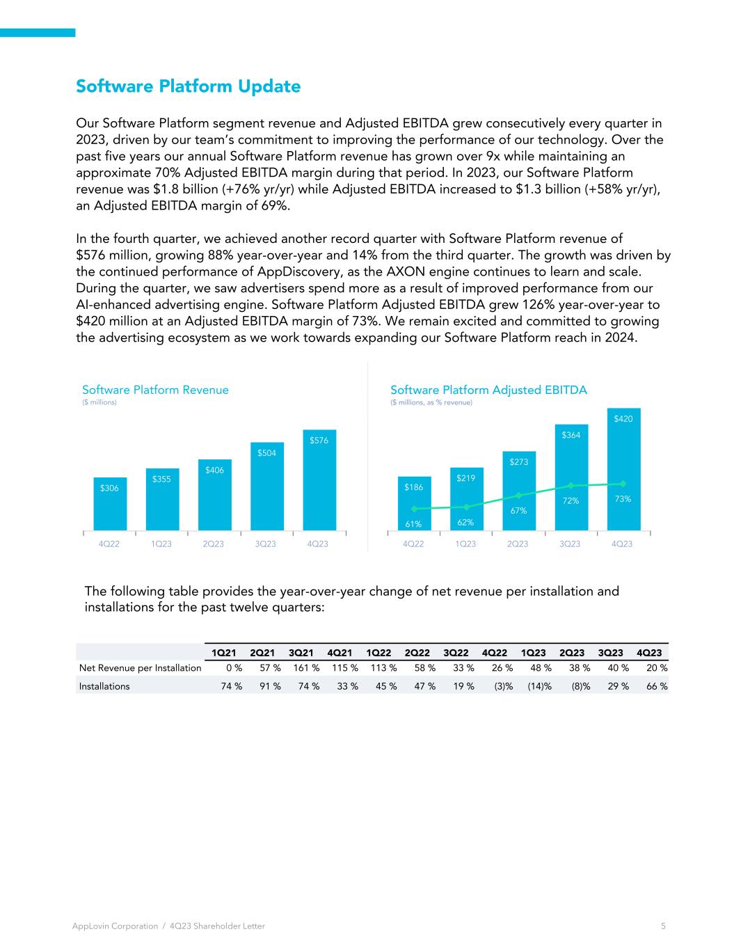 Software Platform Update Our Software Platform segment revenue and Adjusted EBITDA grew consecutively every quarter in 2023, driven by our team’s commitment to improving the performance of our technology. Over the past five years our annual Software Platform revenue has grown over 9x while maintaining an approximate 70% Adjusted EBITDA margin during that period. In 2023, our Software Platform revenue was $1.8 billion (+76% yr/yr) while Adjusted EBITDA increased to $1.3 billion (+58% yr/yr), an Adjusted EBITDA margin of 69%. In the fourth quarter, we achieved another record quarter with Software Platform revenue of $576 million, growing 88% year-over-year and 14% from the third quarter. The growth was driven by the continued performance of AppDiscovery, as the AXON engine continues to learn and scale. During the quarter, we saw advertisers spend more as a result of improved performance from our AI-enhanced advertising engine. Software Platform Adjusted EBITDA grew 126% year-over-year to $420 million at an Adjusted EBITDA margin of 73%. We remain excited and committed to growing the advertising ecosystem as we work towards expanding our Software Platform reach in 2024. $306 $355 $406 $504 $576 4Q22 1Q23 2Q23 3Q23 4Q23 Software Platform Revenue ($ millions) $186 $219 $273 $364 $420 61% 62% 67% 72% 73% 4Q22 1Q23 2Q23 3Q23 4Q23 Software Platform Adjusted EBITDA ($ millions, as % revenue) AppLovin Corporation / 4Q23 Shareholder Letter 5 1Q21 2Q21 3Q21 4Q21 1Q22 2Q22 3Q22 4Q22 1Q23 2Q23 3Q23 4Q23 Net Revenue per Installation 0 % 57 % 161 % 115 % 113 % 58 % 33 % 26 % 48 % 38 % 40 % 20 % Installations 74 % 91 % 74 % 33 % 45 % 47 % 19 % (3) % (14) % (8) % 29 % 66 % The following table provides the year-over-year change of net revenue per installation and installations for the past twelve quarters: