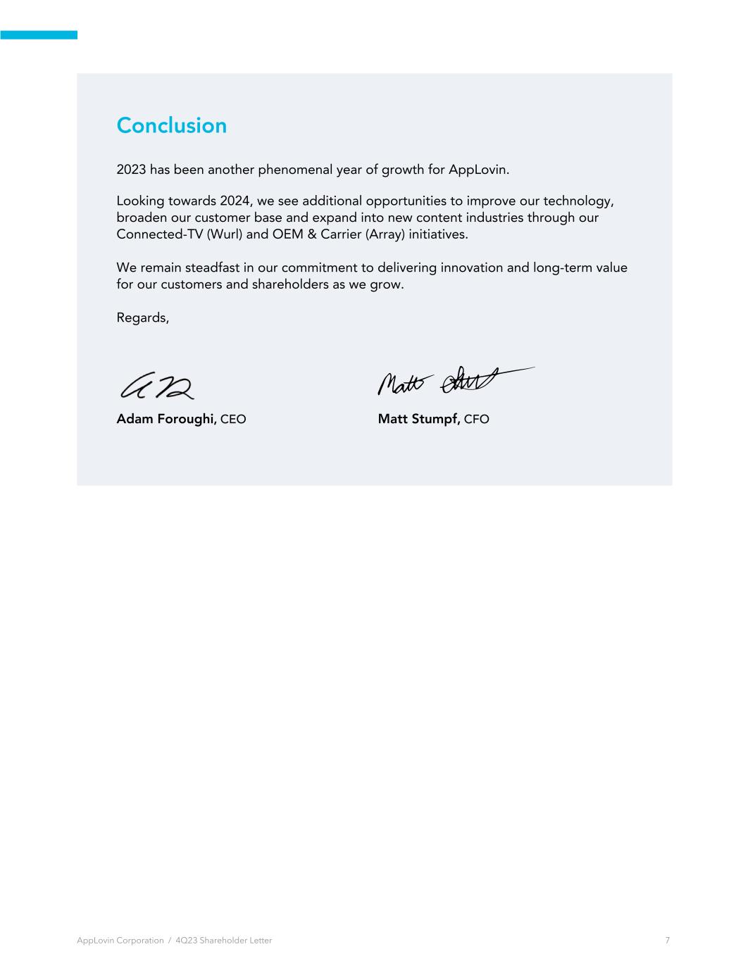 Conclusion 2023 has been another phenomenal year of growth for AppLovin. Looking towards 2024, we see additional opportunities to improve our technology, broaden our customer base and expand into new content industries through our Connected-TV (Wurl) and OEM & Carrier (Array) initiatives. We remain steadfast in our commitment to delivering innovation and long-term value for our customers and shareholders as we grow. Regards, Adam Foroughi, CEO Matt Stumpf, CFO AppLovin Corporation / 4Q23 Shareholder Letter 7