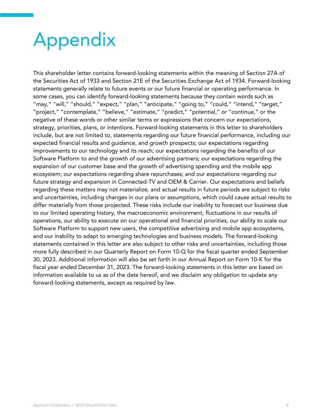 Appendix This shareholder letter contains forward-looking statements within the meaning of Section 27A of the Securities Act of 1933 and Section 21E of the Securities Exchange Act of 1934. Forward-looking statements generally relate to future events or our future financial or operating performance. In some cases, you can identify forward-looking statements because they contain words such as “may,” “will,” “should,” “expect,” “plan,” “anticipate,” “going to,” “could,” “intend,” “target,” “project,” “contemplate,” “believe,” “estimate,” “predict,” “potential,” or “continue,” or the negative of these words or other similar terms or expressions that concern our expectations, strategy, priorities, plans, or intentions. Forward-looking statements in this letter to shareholders include, but are not limited to, statements regarding our future financial performance, including our expected financial results and guidance, and growth prospects; our expectations regarding improvements to our technology and its reach; our expectations regarding the benefits of our Software Platform to and the growth of our advertising partners; our expectations regarding the expansion of our customer base and the growth of advertising spending and the mobile app ecosystem; our expectations regarding share repurchases; and our expectations regarding our future strategy and expansion in Connected-TV and OEM & Carrier. Our expectations and beliefs regarding these matters may not materialize, and actual results in future periods are subject to risks and uncertainties, including changes in our plans or assumptions, which could cause actual results to differ materially from those projected. These risks include our inability to forecast our business due to our limited operating history, the macroeconomic environment, fluctuations in our results of operations, our ability to execute on our operational and financial priorities, our ability to scale our Software Platform to support new users, the competitive advertising and mobile app ecosystems, and our inability to adapt to emerging technologies and business models. The forward-looking statements contained in this letter are also subject to other risks and uncertainties, including those more fully described in our Quarterly Report on Form 10-Q for the fiscal quarter ended September 30, 2023. Additional information will also be set forth in our Annual Report on Form 10-K for the fiscal year ended December 31, 2023. The forward-looking statements in this letter are based on information available to us as of the date hereof, and we disclaim any obligation to update any forward-looking statements, except as required by law. AppLovin Corporation / 4Q23 Shareholder Letter 8