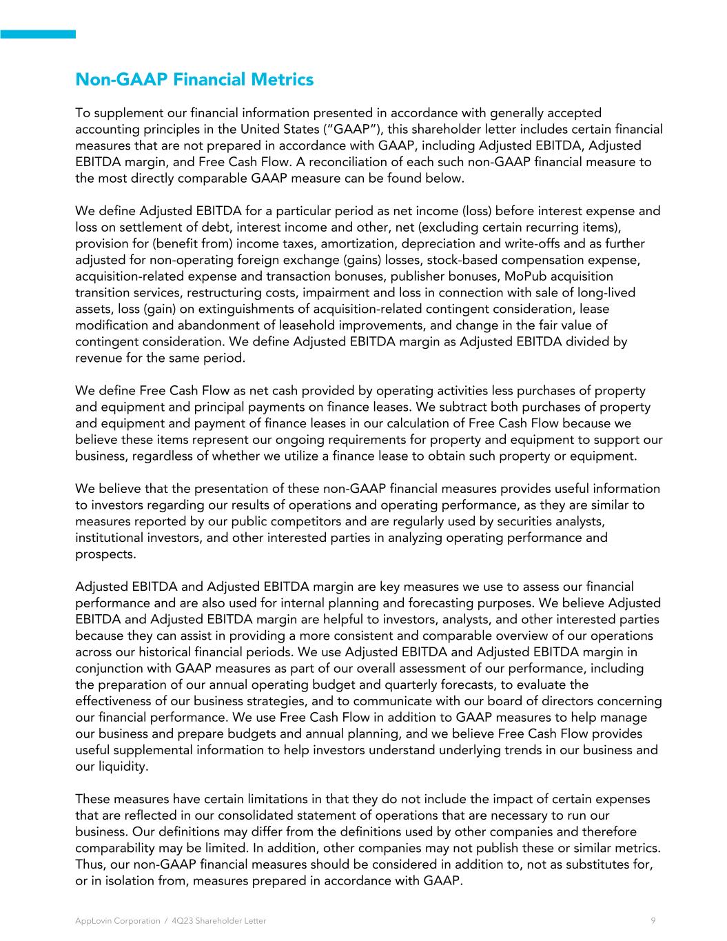 Non-GAAP Financial Metrics To supplement our financial information presented in accordance with generally accepted accounting principles in the United States (“GAAP”), this shareholder letter includes certain financial measures that are not prepared in accordance with GAAP, including Adjusted EBITDA, Adjusted EBITDA margin, and Free Cash Flow. A reconciliation of each such non-GAAP financial measure to the most directly comparable GAAP measure can be found below. We define Adjusted EBITDA for a particular period as net income (loss) before interest expense and loss on settlement of debt, interest income and other, net (excluding certain recurring items), provision for (benefit from) income taxes, amortization, depreciation and write-offs and as further adjusted for non-operating foreign exchange (gains) losses, stock-based compensation expense, acquisition-related expense and transaction bonuses, publisher bonuses, MoPub acquisition transition services, restructuring costs, impairment and loss in connection with sale of long-lived assets, loss (gain) on extinguishments of acquisition-related contingent consideration, lease modification and abandonment of leasehold improvements, and change in the fair value of contingent consideration. We define Adjusted EBITDA margin as Adjusted EBITDA divided by revenue for the same period. We define Free Cash Flow as net cash provided by operating activities less purchases of property and equipment and principal payments on finance leases. We subtract both purchases of property and equipment and payment of finance leases in our calculation of Free Cash Flow because we believe these items represent our ongoing requirements for property and equipment to support our business, regardless of whether we utilize a finance lease to obtain such property or equipment. We believe that the presentation of these non-GAAP financial measures provides useful information to investors regarding our results of operations and operating performance, as they are similar to measures reported by our public competitors and are regularly used by securities analysts, institutional investors, and other interested parties in analyzing operating performance and prospects. Adjusted EBITDA and Adjusted EBITDA margin are key measures we use to assess our financial performance and are also used for internal planning and forecasting purposes. We believe Adjusted EBITDA and Adjusted EBITDA margin are helpful to investors, analysts, and other interested parties because they can assist in providing a more consistent and comparable overview of our operations across our historical financial periods. We use Adjusted EBITDA and Adjusted EBITDA margin in conjunction with GAAP measures as part of our overall assessment of our performance, including the preparation of our annual operating budget and quarterly forecasts, to evaluate the effectiveness of our business strategies, and to communicate with our board of directors concerning our financial performance. We use Free Cash Flow in addition to GAAP measures to help manage our business and prepare budgets and annual planning, and we believe Free Cash Flow provides useful supplemental information to help investors understand underlying trends in our business and our liquidity. These measures have certain limitations in that they do not include the impact of certain expenses that are reflected in our consolidated statement of operations that are necessary to run our business. Our definitions may differ from the definitions used by other companies and therefore comparability may be limited. In addition, other companies may not publish these or similar metrics. Thus, our non-GAAP financial measures should be considered in addition to, not as substitutes for, or in isolation from, measures prepared in accordance with GAAP. AppLovin Corporation / 4Q23 Shareholder Letter 9