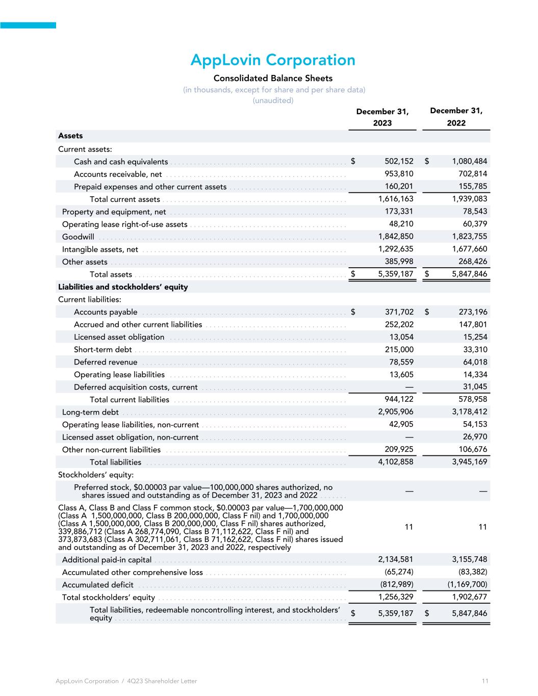 AppLovin Corporation Consolidated Balance Sheets (in thousands, except for share and per share data) (unaudited) December 31, December 31, 2023 2022 Assets Current assets: Cash and cash equivalents . . . . . . . . . . . . . . . . . . . . . . . . . . . . . . . . . . . . . . . . . . . . . $ 502,152 $ 1,080,484 Accounts receivable, net . . . . . . . . . . . . . . . . . . . . . . . . . . . . . . . . . . . . . . . . . . . . . . 953,810 702,814 Prepaid expenses and other current assets . . . . . . . . . . . . . . . . . . . . . . . . . . . . . . 160,201 155,785 Total current assets . . . . . . . . . . . . . . . . . . . . . . . . . . . . . . . . . . . . . . . . . . . . . . . 1,616,163 1,939,083 Property and equipment, net . . . . . . . . . . . . . . . . . . . . . . . . . . . . . . . . . . . . . . . . . . . . . 173,331 78,543 Operating lease right-of-use assets . . . . . . . . . . . . . . . . . . . . . . . . . . . . . . . . . . . . . . . . 48,210 60,379 Goodwill . . . . . . . . . . . . . . . . . . . . . . . . . . . . . . . . . . . . . . . . . . . . . . . . . . . . . . . . . . . . . . . 1,842,850 1,823,755 Intangible assets, net . . . . . . . . . . . . . . . . . . . . . . . . . . . . . . . . . . . . . . . . . . . . . . . . . . . . 1,292,635 1,677,660 Other assets . . . . . . . . . . . . . . . . . . . . . . . . . . . . . . . . . . . . . . . . . . . . . . . . . . . . . . . . . . . . 385,998 268,426 Total assets . . . . . . . . . . . . . . . . . . . . . . . . . . . . . . . . . . . . . . . . . . . . . . . . . . . . . . $ 5,359,187 $ 5,847,846 Liabilities and stockholders’ equity Current liabilities: Accounts payable . . . . . . . . . . . . . . . . . . . . . . . . . . . . . . . . . . . . . . . . . . . . . . . . . . . . $ 371,702 $ 273,196 Accrued and other current liabilities . . . . . . . . . . . . . . . . . . . . . . . . . . . . . . . . . . . . 252,202 147,801 Licensed asset obligation . . . . . . . . . . . . . . . . . . . . . . . . . . . . . . . . . . . . . . . . . . . . . 13,054 15,254 Short-term debt . . . . . . . . . . . . . . . . . . . . . . . . . . . . . . . . . . . . . . . . . . . . . . . . . . . . . . 215,000 33,310 Deferred revenue . . . . . . . . . . . . . . . . . . . . . . . . . . . . . . . . . . . . . . . . . . . . . . . . . . . . 78,559 64,018 Operating lease liabilities . . . . . . . . . . . . . . . . . . . . . . . . . . . . . . . . . . . . . . . . . . . . . 13,605 14,334 Deferred acquisition costs, current . . . . . . . . . . . . . . . . . . . . . . . . . . . . . . . . . . . . . — 31,045 Total current liabilities . . . . . . . . . . . . . . . . . . . . . . . . . . . . . . . . . . . . . . . . . . . . 944,122 578,958 Long-term debt . . . . . . . . . . . . . . . . . . . . . . . . . . . . . . . . . . . . . . . . . . . . . . . . . . . . . . . . . 2,905,906 3,178,412 Operating lease liabilities, non-current . . . . . . . . . . . . . . . . . . . . . . . . . . . . . . . . . . . . . 42,905 54,153 Licensed asset obligation, non-current . . . . . . . . . . . . . . . . . . . . . . . . . . . . . . . . . . . . . — 26,970 Other non-current liabilities . . . . . . . . . . . . . . . . . . . . . . . . . . . . . . . . . . . . . . . . . . . . . . 209,925 106,676 Total liabilities . . . . . . . . . . . . . . . . . . . . . . . . . . . . . . . . . . . . . . . . . . . . . . . . . . . 4,102,858 3,945,169 Stockholders’ equity: Preferred stock, $0.00003 par value—100,000,000 shares authorized, no shares issued and outstanding as of December 31, 2023 and 2022 . . . . . . . — — Class A, Class B and Class F common stock, $0.00003 par value—1,700,000,000 (Class A 1,500,000,000, Class B 200,000,000, Class F nil) and 1,700,000,000 (Class A 1,500,000,000, Class B 200,000,000, Class F nil) shares authorized, 339,886,712 (Class A 268,774,090, Class B 71,112,622, Class F nil) and 373,873,683 (Class A 302,711,061, Class B 71,162,622, Class F nil) shares issued and outstanding as of December 31, 2023 and 2022, respectively 11 11 Additional paid-in capital . . . . . . . . . . . . . . . . . . . . . . . . . . . . . . . . . . . . . . . . . . . . . . . . . 2,134,581 3,155,748 Accumulated other comprehensive loss . . . . . . . . . . . . . . . . . . . . . . . . . . . . . . . . . . . . (65,274) (83,382) Accumulated deficit . . . . . . . . . . . . . . . . . . . . . . . . . . . . . . . . . . . . . . . . . . . . . . . . . . . . . (812,989) (1,169,700) Total stockholders’ equity . . . . . . . . . . . . . . . . . . . . . . . . . . . . . . . . . . . . . . . . . . . . . . . . 1,256,329 1,902,677 Total liabilities, redeemable noncontrolling interest, and stockholders’ equity . . . . . . . . . . . . . . . . . . . . . . . . . . . . . . . . . . . . . . . . . . . . . . . . . . . . . . . . . . . $ 5,359,187 $ 5,847,846 AppLovin Corporation / 4Q23 Shareholder Letter 11