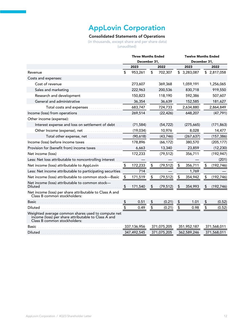 AppLovin Corporation Consolidated Statements of Operations (in thousands, except share and per share data) (unaudited) Three Months Ended Twelve Months Ended December 31, December 31, 2023 2022 2023 2022 Revenue $ 953,261 $ 702,307 $ 3,283,087 $ 2,817,058 Costs and expenses: Cost of revenue 273,607 369,368 1,059,191 1,256,065 Sales and marketing 222,963 200,536 830,718 919,550 Research and development 150,823 118,190 592,386 507,607 General and administrative 36,354 36,639 152,585 181,627 Total costs and expenses . . . . . . . . . . . . . . . . . . 683,747 724,733 2,634,880 2,864,849 Income (loss) from operations . . . . . . . . . . . . . . . . . . . . . . . . 269,514 (22,426) 648,207 (47,791) Other income (expense): Interest expense and loss on settlement of debt . . . (71,584) (54,722) (275,665) (171,863) Other Income (expense), net . . . . . . . . . . . . . . . . . . . . . (19,034) 10,976 8,028 14,477 Total other expense, net . . . . . . . . . . . . . . . . . . (90,618) (43,746) (267,637) (157,386) Income (loss) before income taxes . . . . . . . . . . . . . . . . . . . . 178,896 (66,172) 380,570 (205,177) Provision for (benefit from) income taxes . . . . . . . . . . . . . . 6,663 13,340 23,859 (12,230) Net income (loss) . . . . . . . . . . . . . . . . . . . . . . . . . . . . . . . . . . . 172,233 (79,512) 356,711 (192,947) Less: Net loss attributable to noncontrolling interest . . . — — — (201) Net income (loss) attributable to AppLovin . . . . . . . . . . . . $ 172,233 $ (79,512) $ 356,711 $ (192,746) Less: Net income attributable to participating securities 714 — 1,769 — Net income (loss) attributable to common stock—Basic . $ 171,519 $ (79,512) $ 354,942 $ (192,746) Net income (loss) attributable to common stock— Diluted . . . . . . . . . . . . . . . . . . . . . . . . . . . . . . . . . . . . . . . . . . . . $ 171,540 $ (79,512) $ 354,993 $ (192,746) Net income (loss) per share attributable to Class A and Class B common stockholders: Basic . . . . . . . . . . . . . . . . . . . . . . . . . . . . . . . . . . . . . . . . . . . . . . $ 0.51 $ (0.21) $ 1.01 $ (0.52) Diluted . . . . . . . . . . . . . . . . . . . . . . . . . . . . . . . . . . . . . . . . . . . . $ 0.49 $ (0.21) $ 0.98 $ (0.52) Weighted average common shares used to compute net income (loss) per share attributable to Class A and Class B common stockholders: Basic . . . . . . . . . . . . . . . . . . . . . . . . . . . . . . . . . . . . . . . . . . . . . . 337,136,956 371,075,205 351,952,187 371,568,011 Diluted . . . . . . . . . . . . . . . . . . . . . . . . . . . . . . . . . . . . . . . . . . . . 347,492,545 371,075,205 362,589,246 371,568,011 AppLovin Corporation / 4Q23 Shareholder Letter 12