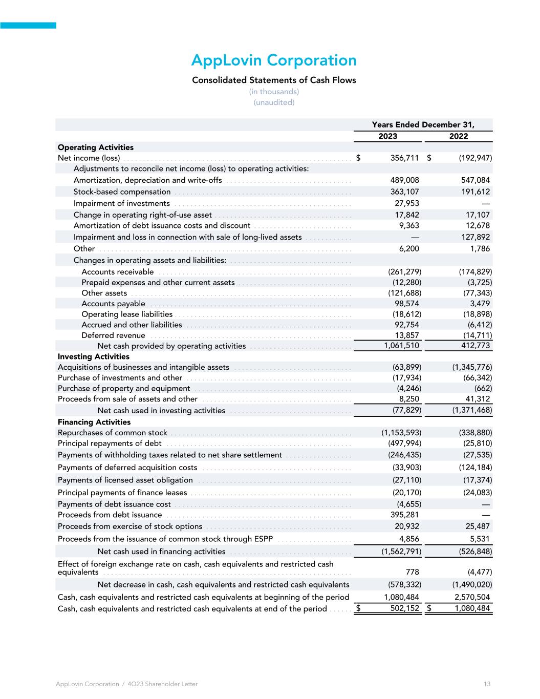 AppLovin Corporation Consolidated Statements of Cash Flows (in thousands) (unaudited) Years Ended December 31, 2023 2022 Operating Activities Net income (loss) . . . . . . . . . . . . . . . . . . . . . . . . . . . . . . . . . . . . . . . . . . . . . . . . . . . . . . . . . . $ 356,711 $ (192,947) Adjustments to reconcile net income (loss) to operating activities: Amortization, depreciation and write-offs . . . . . . . . . . . . . . . . . . . . . . . . . . . . . . . . 489,008 547,084 Stock-based compensation . . . . . . . . . . . . . . . . . . . . . . . . . . . . . . . . . . . . . . . . . . . . . 363,107 191,612 Impairment of investments . . . . . . . . . . . . . . . . . . . . . . . . . . . . . . . . . . . . . . . . . . . . . 27,953 — Change in operating right-of-use asset . . . . . . . . . . . . . . . . . . . . . . . . . . . . . . . . . . . 17,842 17,107 Amortization of debt issuance costs and discount . . . . . . . . . . . . . . . . . . . . . . . . . 9,363 12,678 Impairment and loss in connection with sale of long-lived assets . . . . . . . . . . . . — 127,892 Other . . . . . . . . . . . . . . . . . . . . . . . . . . . . . . . . . . . . . . . . . . . . . . . . . . . . . . . . . . . . . . . . 6,200 1,786 Changes in operating assets and liabilities: . . . . . . . . . . . . . . . . . . . . . . . . . . . . . . . Accounts receivable . . . . . . . . . . . . . . . . . . . . . . . . . . . . . . . . . . . . . . . . . . . . . . . . . (261,279) (174,829) Prepaid expenses and other current assets . . . . . . . . . . . . . . . . . . . . . . . . . . . . . (12,280) (3,725) Other assets . . . . . . . . . . . . . . . . . . . . . . . . . . . . . . . . . . . . . . . . . . . . . . . . . . . . . . . . (121,688) (77,343) Accounts payable . . . . . . . . . . . . . . . . . . . . . . . . . . . . . . . . . . . . . . . . . . . . . . . . . . . 98,574 3,479 Operating lease liabilities . . . . . . . . . . . . . . . . . . . . . . . . . . . . . . . . . . . . . . . . . . . . . (18,612) (18,898) Accrued and other liabilities . . . . . . . . . . . . . . . . . . . . . . . . . . . . . . . . . . . . . . . . . . 92,754 (6,412) Deferred revenue . . . . . . . . . . . . . . . . . . . . . . . . . . . . . . . . . . . . . . . . . . . . . . . . . . . 13,857 (14,711) Net cash provided by operating activities . . . . . . . . . . . . . . . . . . . . . . . . . . 1,061,510 412,773 Investing Activities Acquisitions of businesses and intangible assets . . . . . . . . . . . . . . . . . . . . . . . . . . . . . . (63,899) (1,345,776) Purchase of investments and other . . . . . . . . . . . . . . . . . . . . . . . . . . . . . . . . . . . . . . . . . . (17,934) (66,342) Purchase of property and equipment . . . . . . . . . . . . . . . . . . . . . . . . . . . . . . . . . . . . . . . . (4,246) (662) Proceeds from sale of assets and other . . . . . . . . . . . . . . . . . . . . . . . . . . . . . . . . . . . . . . 8,250 41,312 Net cash used in investing activities . . . . . . . . . . . . . . . . . . . . . . . . . . . . . . . (77,829) (1,371,468) Financing Activities Repurchases of common stock . . . . . . . . . . . . . . . . . . . . . . . . . . . . . . . . . . . . . . . . . . . . . . (1,153,593) (338,880) Principal repayments of debt . . . . . . . . . . . . . . . . . . . . . . . . . . . . . . . . . . . . . . . . . . . . . . . (497,994) (25,810) Payments of withholding taxes related to net share settlement . . . . . . . . . . . . . . . . . (246,435) (27,535) Payments of deferred acquisition costs . . . . . . . . . . . . . . . . . . . . . . . . . . . . . . . . . . . . . . (33,903) (124,184) Payments of licensed asset obligation . . . . . . . . . . . . . . . . . . . . . . . . . . . . . . . . . . . . . . . (27,110) (17,374) Principal payments of finance leases . . . . . . . . . . . . . . . . . . . . . . . . . . . . . . . . . . . . . . . . . (20,170) (24,083) Payments of debt issuance cost . . . . . . . . . . . . . . . . . . . . . . . . . . . . . . . . . . . . . . . . . . . . . (4,655) — Proceeds from debt issuance . . . . . . . . . . . . . . . . . . . . . . . . . . . . . . . . . . . . . . . . . . . . . . . 395,281 — Proceeds from exercise of stock options . . . . . . . . . . . . . . . . . . . . . . . . . . . . . . . . . . . . . 20,932 25,487 Proceeds from the issuance of common stock through ESPP . . . . . . . . . . . . . . . . . . . 4,856 5,531 Net cash used in financing activities . . . . . . . . . . . . . . . . . . . . . . . . . . . . . . . (1,562,791) (526,848) Effect of foreign exchange rate on cash, cash equivalents and restricted cash equivalents . . . . . . . . . . . . . . . . . . . . . . . . . . . . . . . . . . . . . . . . . . . . . . . . . . . . . . . . . . . . . . . 778 (4,477) Net decrease in cash, cash equivalents and restricted cash equivalents (578,332) (1,490,020) Cash, cash equivalents and restricted cash equivalents at beginning of the period 1,080,484 2,570,504 Cash, cash equivalents and restricted cash equivalents at end of the period . . . . . . $ 502,152 $ 1,080,484 AppLovin Corporation / 4Q23 Shareholder Letter 13