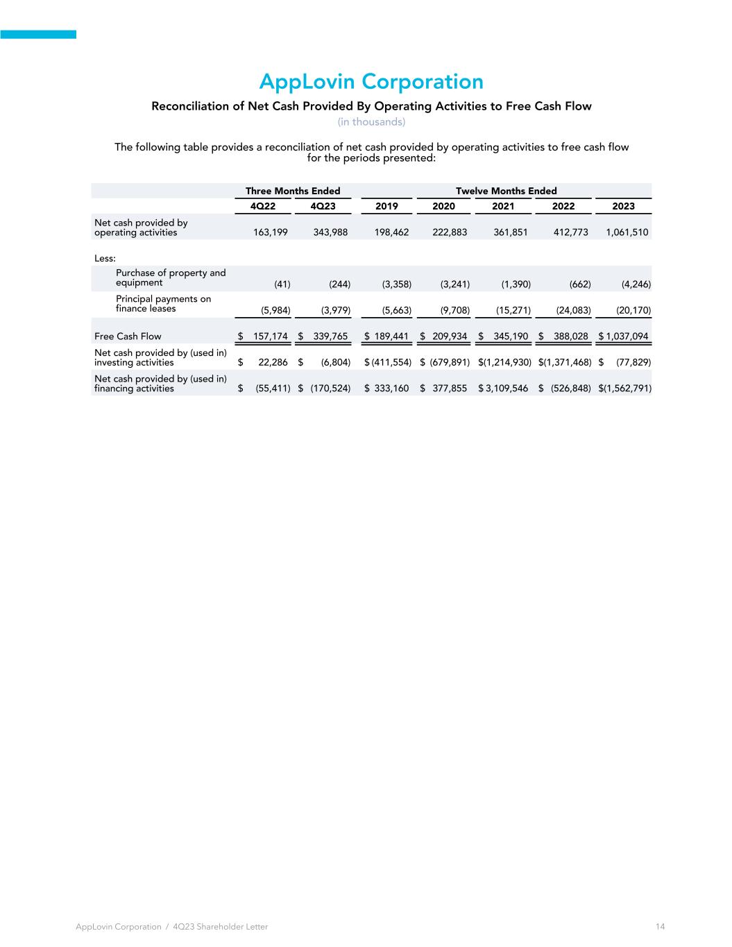 AppLovin Corporation Reconciliation of Net Cash Provided By Operating Activities to Free Cash Flow (in thousands) The following table provides a reconciliation of net cash provided by operating activities to free cash flow for the periods presented: Three Months Ended Twelve Months Ended 4Q22 4Q23 2019 2020 2021 2022 2023 Net cash provided by operating activities 163,199 343,988 198,462 222,883 361,851 412,773 1,061,510 Less: Purchase of property and equipment (41) (244) (3,358) (3,241) (1,390) (662) (4,246) Principal payments on finance leases (5,984) (3,979) (5,663) (9,708) (15,271) (24,083) (20,170) Free Cash Flow $ 157,174 $ 339,765 $ 189,441 $ 209,934 $ 345,190 $ 388,028 $ 1,037,094 Net cash provided by (used in) investing activities $ 22,286 $ (6,804) $ (411,554) $ (679,891) $ (1,214,930) $ (1,371,468) $ (77,829) Net cash provided by (used in) financing activities $ (55,411) $ (170,524) $ 333,160 $ 377,855 $ 3,109,546 $ (526,848) $ (1,562,791) AppLovin Corporation / 4Q23 Shareholder Letter 14