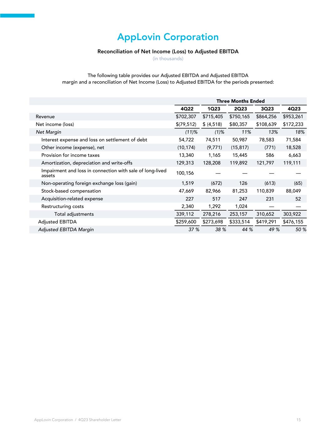 AppLovin Corporation Reconciliation of Net Income (Loss) to Adjusted EBITDA (in thousands) The following table provides our Adjusted EBITDA and Adjusted EBITDA margin and a reconciliation of Net Income (Loss) to Adjusted EBITDA for the periods presented: Three Months Ended 4Q22 1Q23 2Q23 3Q23 4Q23 Revenue $ 702,307 $ 715,405 $ 750,165 $ 864,256 $ 953,261 Net income (loss) $ (79,512) $ (4,518) $ 80,357 $ 108,639 $ 172,233 Net Margin (11) % (1) % 11 % 13 % 18 % Interest expense and loss on settlement of debt 54,722 74,511 50,987 78,583 71,584 Other income (expense), net (10,174) (9,771) (15,817) (771) 18,528 Provision for income taxes 13,340 1,165 15,445 586 6,663 Amortization, depreciation and write-offs 129,313 128,208 119,892 121,797 119,111 Impairment and loss in connection with sale of long-lived assets 100,156 — — — — Non-operating foreign exchange loss (gain) 1,519 (672) 126 (613) (65) Stock-based compensation 47,669 82,966 81,253 110,839 88,049 Acquisition-related expense 227 517 247 231 52 Restructuring costs 2,340 1,292 1,024 — — Total adjustments 339,112 278,216 253,157 310,652 303,922 Adjusted EBITDA $ 259,600 $ 273,698 $ 333,514 $ 419,291 $ 476,155 Adjusted EBITDA Margin 37 % 38 % 44 % 49 % 50 % AppLovin Corporation / 4Q23 Shareholder Letter 15