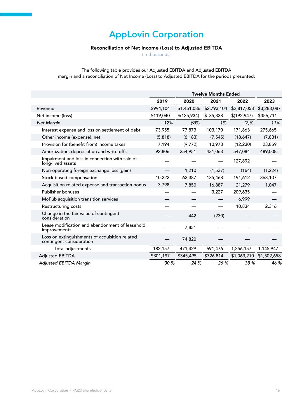 AppLovin Corporation Reconciliation of Net Income (Loss) to Adjusted EBITDA (in thousands) The following table provides our Adjusted EBITDA and Adjusted EBITDA margin and a reconciliation of Net Income (Loss) to Adjusted EBITDA for the periods presented: Twelve Months Ended 2019 2020 2021 2022 2023 Revenue $ 994,104 $ 1,451,086 $ 2,793,104 $ 2,817,058 $ 3,283,087 Net income (loss) $ 119,040 $ (125,934) $ 35,338 $ (192,947) $ 356,711 Net Margin 12 % (9) % 1 % (7) % 11 % Interest expense and loss on settlement of debt 73,955 77,873 103,170 171,863 275,665 Other income (expense), net (5,818) (6,183) (7,545) (18,647) (7,831) Provision for (benefit from) income taxes 7,194 (9,772) 10,973 (12,230) 23,859 Amortization, depreciation and write-offs 92,806 254,951 431,063 547,084 489,008 Impairment and loss in connection with sale of long-lived assets — — — 127,892 — Non-operating foreign exchange loss (gain) — 1,210 (1,537) (164) (1,224) Stock-based compensation 10,222 62,387 135,468 191,612 363,107 Acquisition-related expense and transaction bonus 3,798 7,850 16,887 21,279 1,047 Publisher bonuses — — 3,227 209,635 — MoPub acquisition transition services — — — 6,999 — Restructuring costs — — — 10,834 2,316 Change in the fair value of contingent consideration — 442 (230) — — Lease modification and abandonment of leasehold improvements — 7,851 — — — Loss on extinguishments of acquisition related contingent consideration — 74,820 — — — Total adjustments 182,157 471,429 691,476 1,256,157 1,145,947 Adjusted EBITDA $ 301,197 $ 345,495 $ 726,814 $ 1,063,210 $ 1,502,658 Adjusted EBITDA Margin 30 % 24 % 26 % 38 % 46 % AppLovin Corporation / 4Q23 Shareholder Letter 16