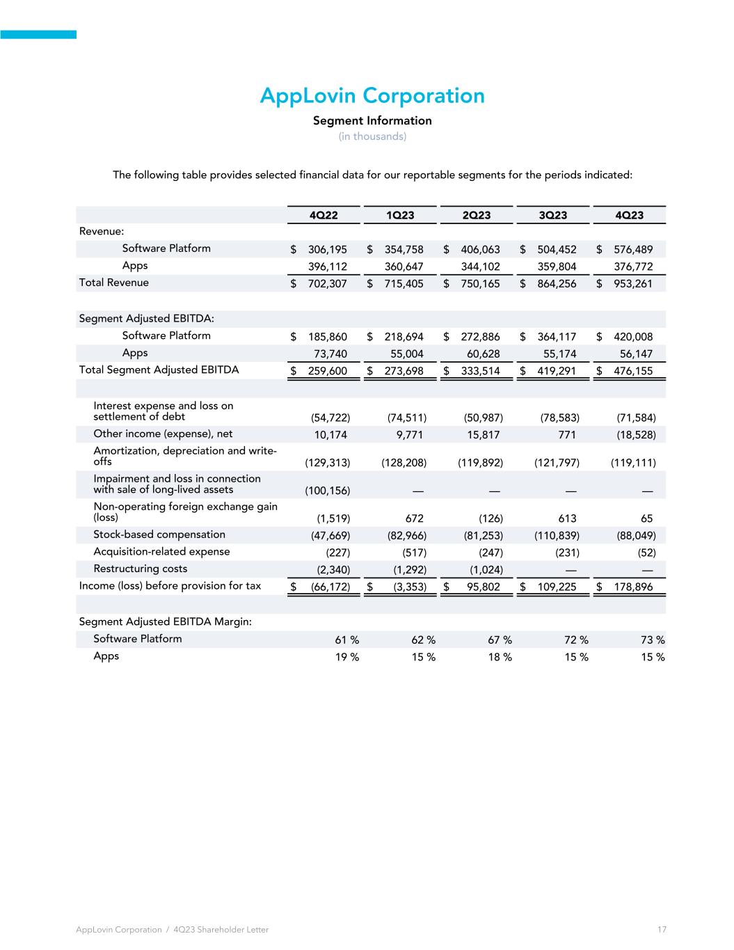 AppLovin Corporation Segment Information (in thousands) The following table provides selected financial data for our reportable segments for the periods indicated: 4Q22 1Q23 2Q23 3Q23 4Q23 Revenue: Software Platform $ 306,195 $ 354,758 $ 406,063 $ 504,452 $ 576,489 Apps 396,112 360,647 344,102 359,804 376,772 Total Revenue $ 702,307 $ 715,405 $ 750,165 $ 864,256 $ 953,261 Segment Adjusted EBITDA: Software Platform $ 185,860 $ 218,694 $ 272,886 $ 364,117 $ 420,008 Apps 73,740 55,004 60,628 55,174 56,147 Total Segment Adjusted EBITDA $ 259,600 $ 273,698 $ 333,514 $ 419,291 $ 476,155 Interest expense and loss on settlement of debt (54,722) (74,511) (50,987) (78,583) (71,584) Other income (expense), net 10,174 9,771 15,817 771 (18,528) Amortization, depreciation and write- offs (129,313) (128,208) (119,892) (121,797) (119,111) Impairment and loss in connection with sale of long-lived assets (100,156) — — — — Non-operating foreign exchange gain (loss) (1,519) 672 (126) 613 65 Stock-based compensation (47,669) (82,966) (81,253) (110,839) (88,049) Acquisition-related expense (227) (517) (247) (231) (52) Restructuring costs (2,340) (1,292) (1,024) — — Income (loss) before provision for tax $ (66,172) $ (3,353) $ 95,802 $ 109,225 $ 178,896 Segment Adjusted EBITDA Margin: Software Platform 61 % 62 % 67 % 72 % 73 % Apps 19 % 15 % 18 % 15 % 15 % AppLovin Corporation / 4Q23 Shareholder Letter 17
