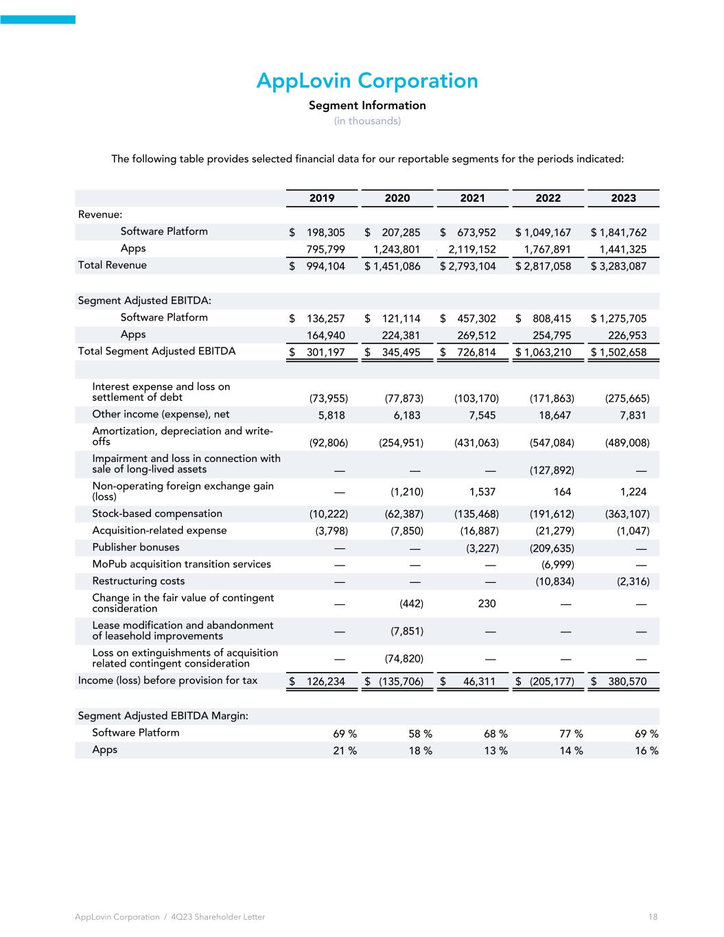 AppLovin Corporation Segment Information (in thousands) The following table provides selected financial data for our reportable segments for the periods indicated: 2019 2020 2021 2022 2023 Revenue: Software Platform $ 198,305 $ 207,285 $ 673,952 $ 1,049,167 $ 1,841,762 Apps 795,799 1,243,801 — 2,119,152 1,767,891 1,441,325 Total Revenue $ 994,104 $ 1,451,086 $ 2,793,104 $ 2,817,058 $ 3,283,087 Segment Adjusted EBITDA: Software Platform $ 136,257 $ 121,114 $ 457,302 $ 808,415 $ 1,275,705 Apps 164,940 224,381 269,512 254,795 226,953 Total Segment Adjusted EBITDA $ 301,197 $ 345,495 $ 726,814 $ 1,063,210 $ 1,502,658 Interest expense and loss on settlement of debt (73,955) (77,873) (103,170) (171,863) (275,665) Other income (expense), net 5,818 6,183 7,545 18,647 7,831 Amortization, depreciation and write- offs (92,806) (254,951) (431,063) (547,084) (489,008) Impairment and loss in connection with sale of long-lived assets — — — (127,892) — Non-operating foreign exchange gain (loss) — (1,210) 1,537 164 1,224 Stock-based compensation (10,222) (62,387) (135,468) (191,612) (363,107) Acquisition-related expense (3,798) (7,850) (16,887) (21,279) (1,047) Publisher bonuses — — (3,227) (209,635) — MoPub acquisition transition services — — — (6,999) — Restructuring costs — — — (10,834) (2,316) Change in the fair value of contingent consideration — (442) 230 — — Lease modification and abandonment of leasehold improvements — (7,851) — — — Loss on extinguishments of acquisition related contingent consideration — (74,820) — — — Income (loss) before provision for tax $ 126,234 $ (135,706) $ 46,311 $ (205,177) $ 380,570 Segment Adjusted EBITDA Margin: Software Platform 69 % 58 % 68 % 77 % 69 % Apps 21 % 18 % 13 % 14 % 16 % AppLovin Corporation / 4Q23 Shareholder Letter 18
